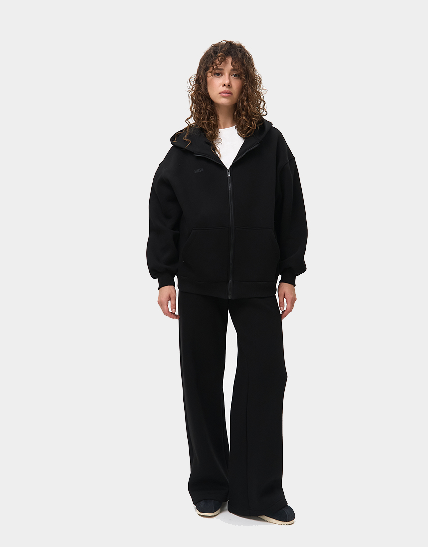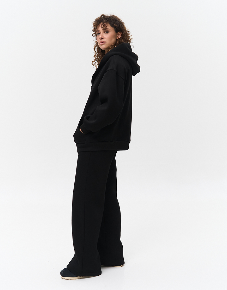 Модель має середню посадку, а цільнокрійний пояс забезпечує м’який і акуратний перехід від стегон до талії без зайвого об’єму. Зручні бічні кишені додають практичності, а фірмовий логотип з італійської каучукової плівки створює стильний та об’ємний акцент.