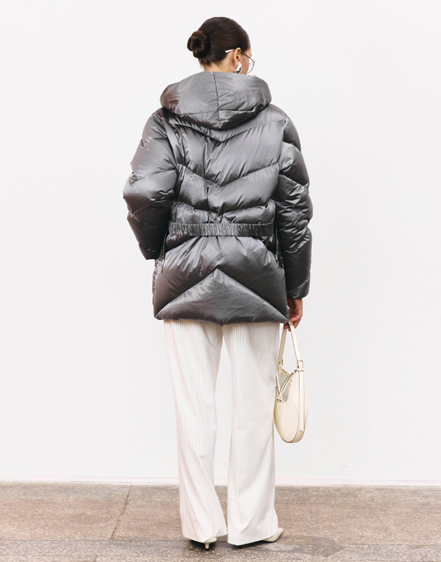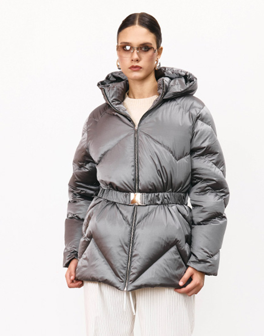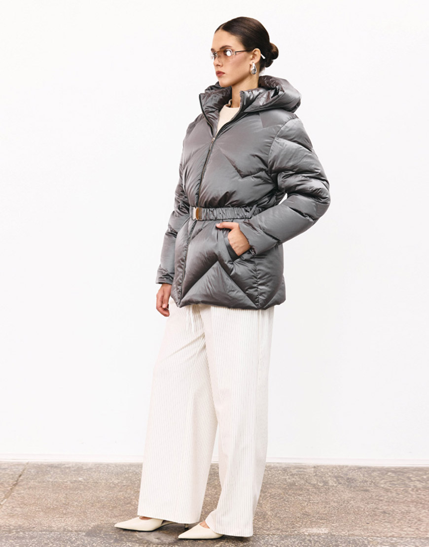 Доставка впродовж 2-7 робочих днівЖіночий пуховик середнього об’єму з капюшоном і паском. Модель Leia входить до лінійки базових пуховиків Marchi. Фігурне стьобання формує силует «пісочний годинник», а еластичний пасок зі сріблястою пряжкою підкреслює талію. Пуховик створений для жінок із впевненим, позачасовим смаком.