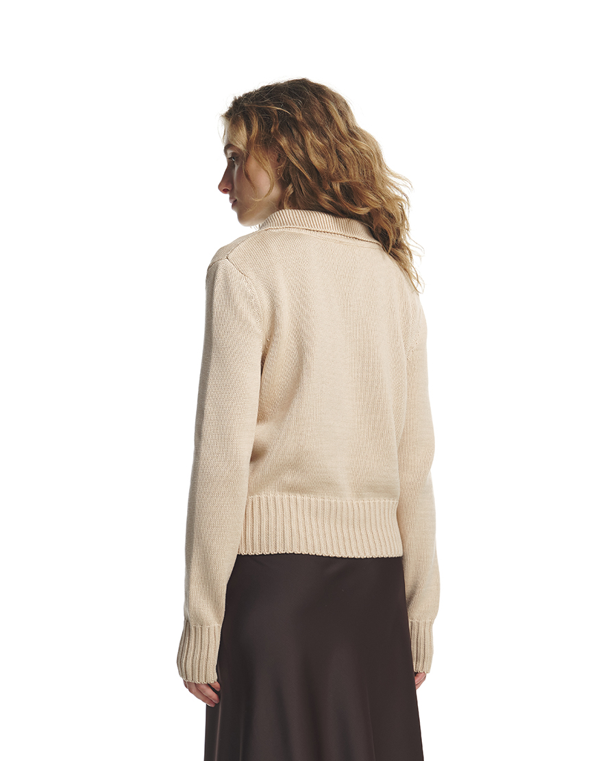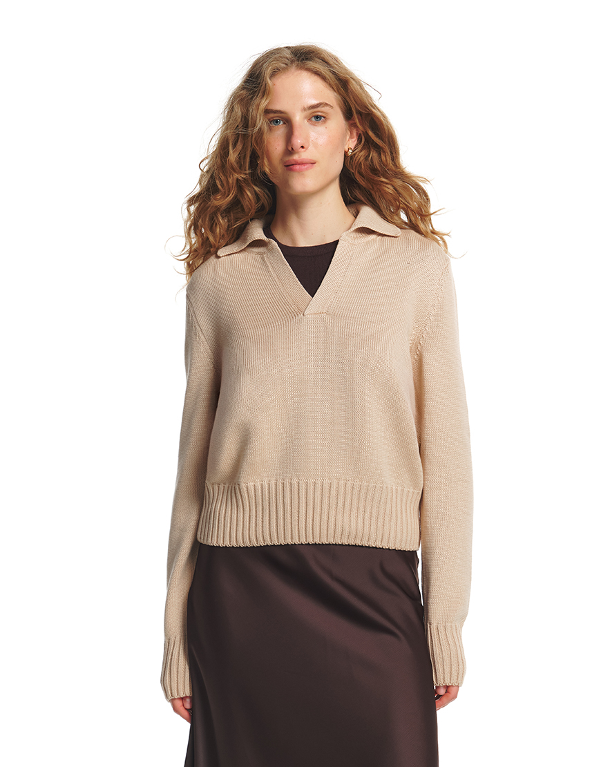 Доставка впродовж 1-2 робочих днівВкорочений джемпер-поло з натуральної бавовни у базовому бежевому кольорі – ідеальне доповнення до модного гардероба. Комфортний, м’який і приємний до тіла, цей джемпер має класичний комір-поло, що додає образу елегантності. Завдяки вкороченому крою чудово підкреслює талію, а манжети та нижній край на резинці забезпечують ідеальну посадку. Легко комбінується з джинсами, брюками чи спідницями, створюючи універсальні та стильні образи на кожен день.