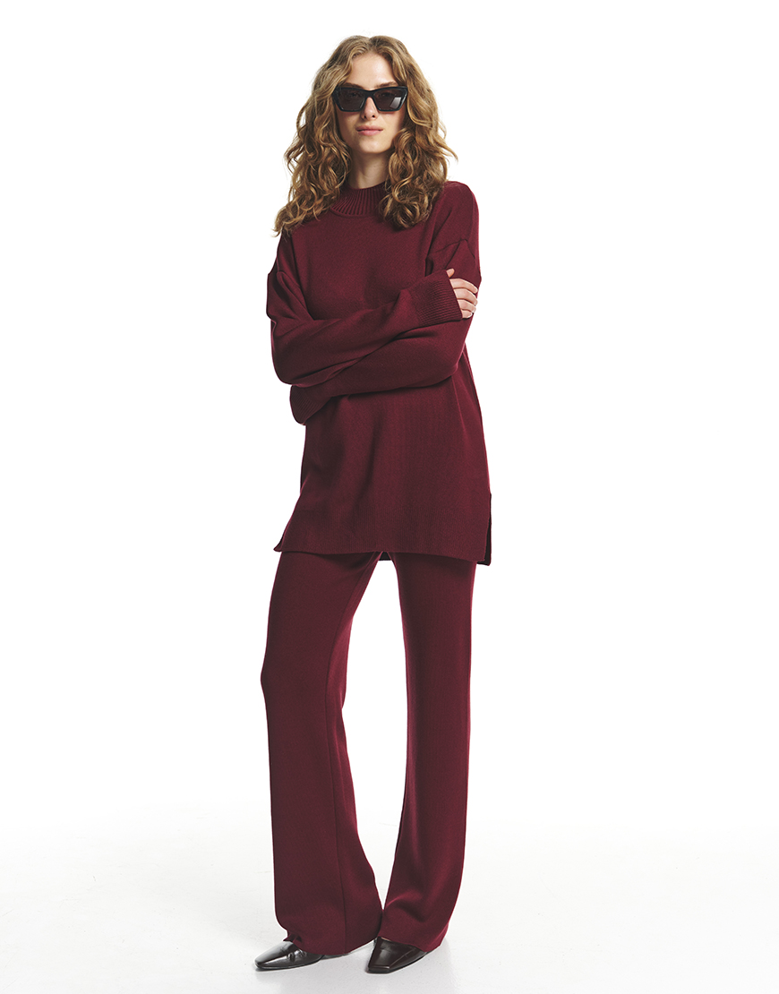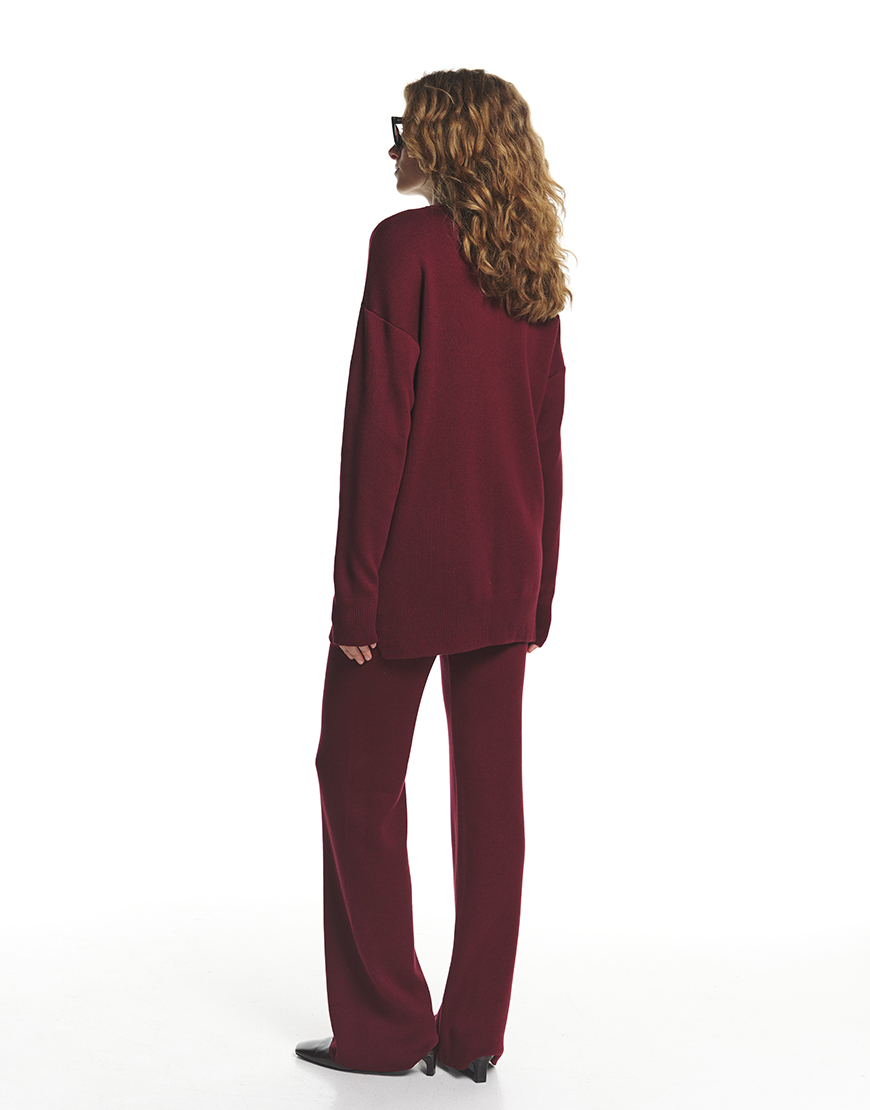 Доставка впродовж 1-2 робочих днівСтильний і комфортний костюм із бавовни в насиченому бордовому кольорі стане ідеальним вибором для поєднання елегантності та зручності. Штани широкого крою з високою посадкою доступні у двох варіантах довжини — 103 см і 109 см, мають пояс на резинці із зав’язками для ідеальної посадки та виконані без кишень, що підкреслює їхню мінімалістичність. Светр доповнює комплект завдяки малій круглій горловині, спущеному рукаву та подовженому силуету, створюючи стильний і розслаблений образ. Натуральна бавовна забезпечує м’якість і комфорт протягом усього дня, роблячи цей костюм ідеальним для будь-яких ситуацій.