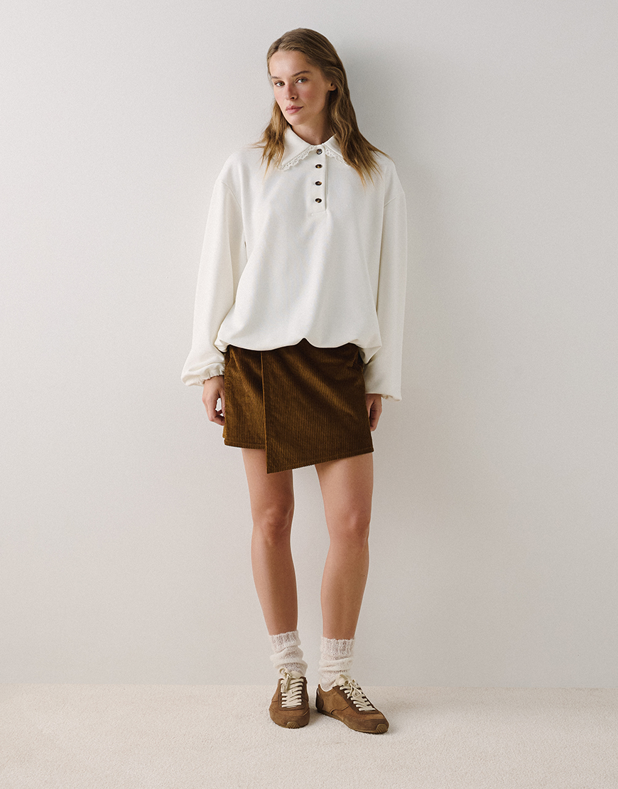 Доставка впродовж 5-14 робочих днів“Cпідниця Journey поєднує класичний матеріал і сучасний крій. Вельвет дарує віпоєднує в собі тепло так комфорт, а асиметричний крій додає виробу сучасності й робить його виразним акцентом у гардеробі. Завдяки глибокому коричневому кольору спідниця легко вписується у базовий гардероб.