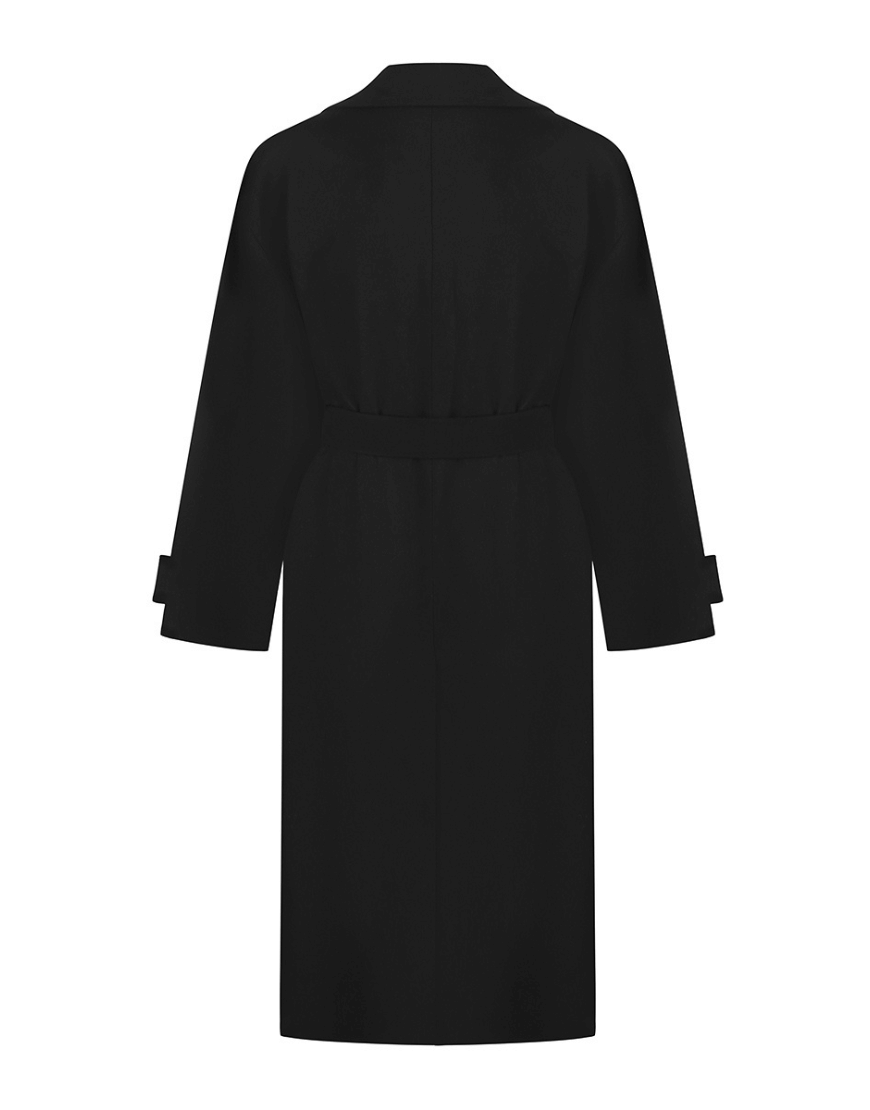Чорне пальто з м’якої вовни оверсайз крою з поясом на кнопках. Має широкий комір та кишені.