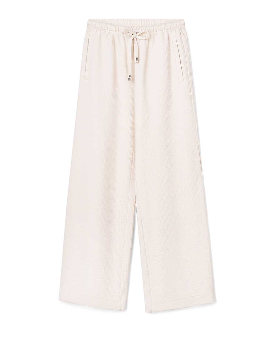 З фактурної тканини бежевого кольору Пояс на зав’язках, з боковими кишенямиБрюки без підкладкиПосадка – може регулюватись