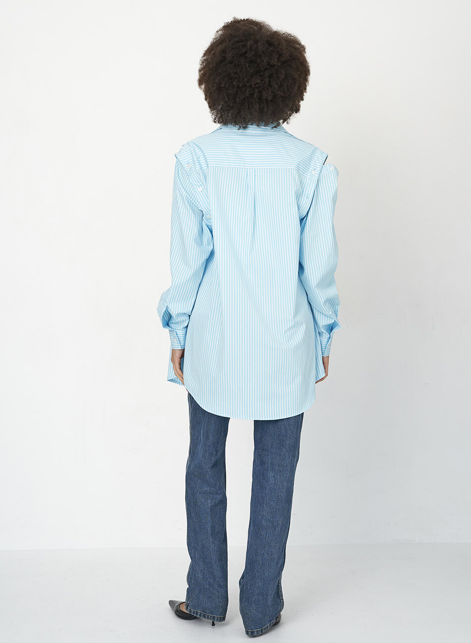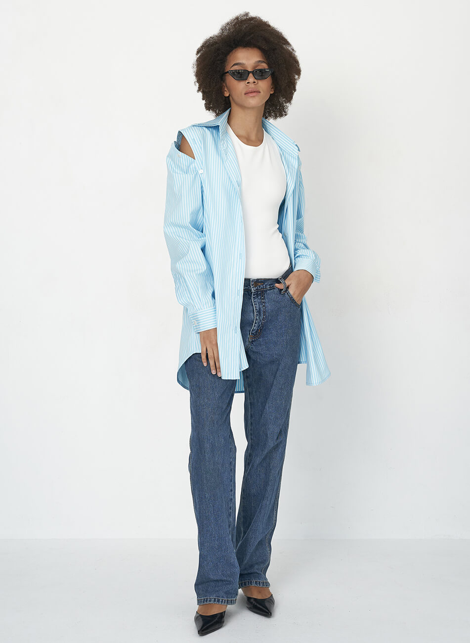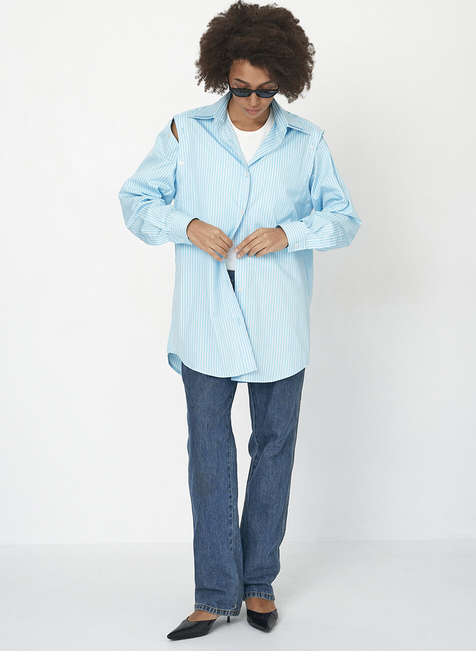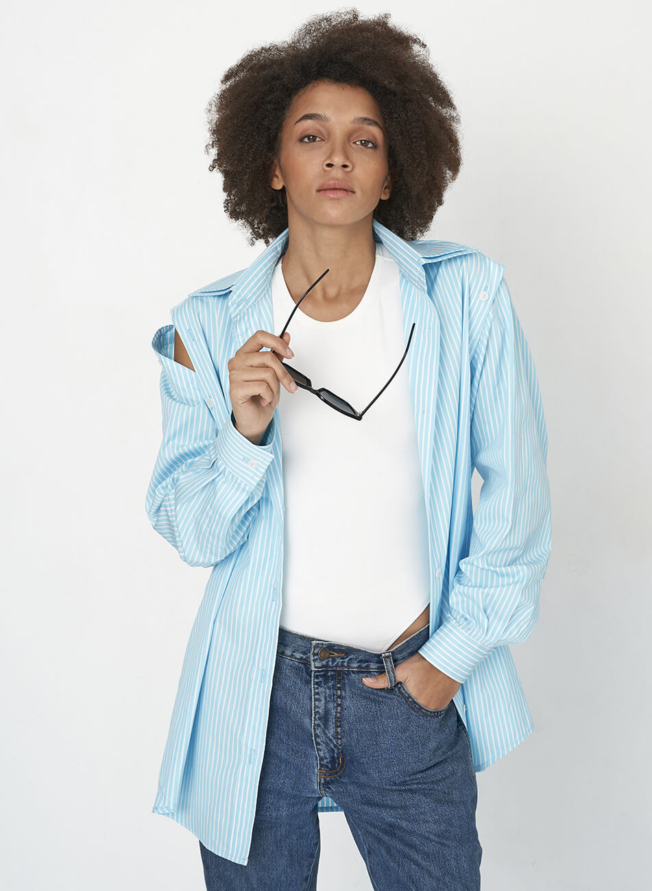Блуза вільного крою із натуральної тканини. Білого кольору в блакитну смужку Сорочка – трансформер, рукави можна відстебнути і таким чином зробити жилет або сексуальні вирізи на плечах.