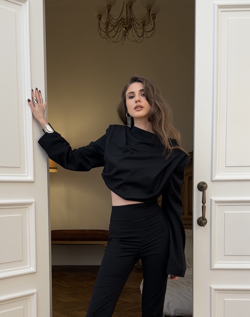 Доставка впродовж 2-5 робочих днівЧорний топ із драпіруванням, що втілює невимушену елегантність. М’які лінії, акцентовані плечі та легка гра текстур створюють образ, сповнений впевненості й витонченості. Ідеальний вибір для вечірніх виходів або як акцент у мінімалістичному гардеробі.