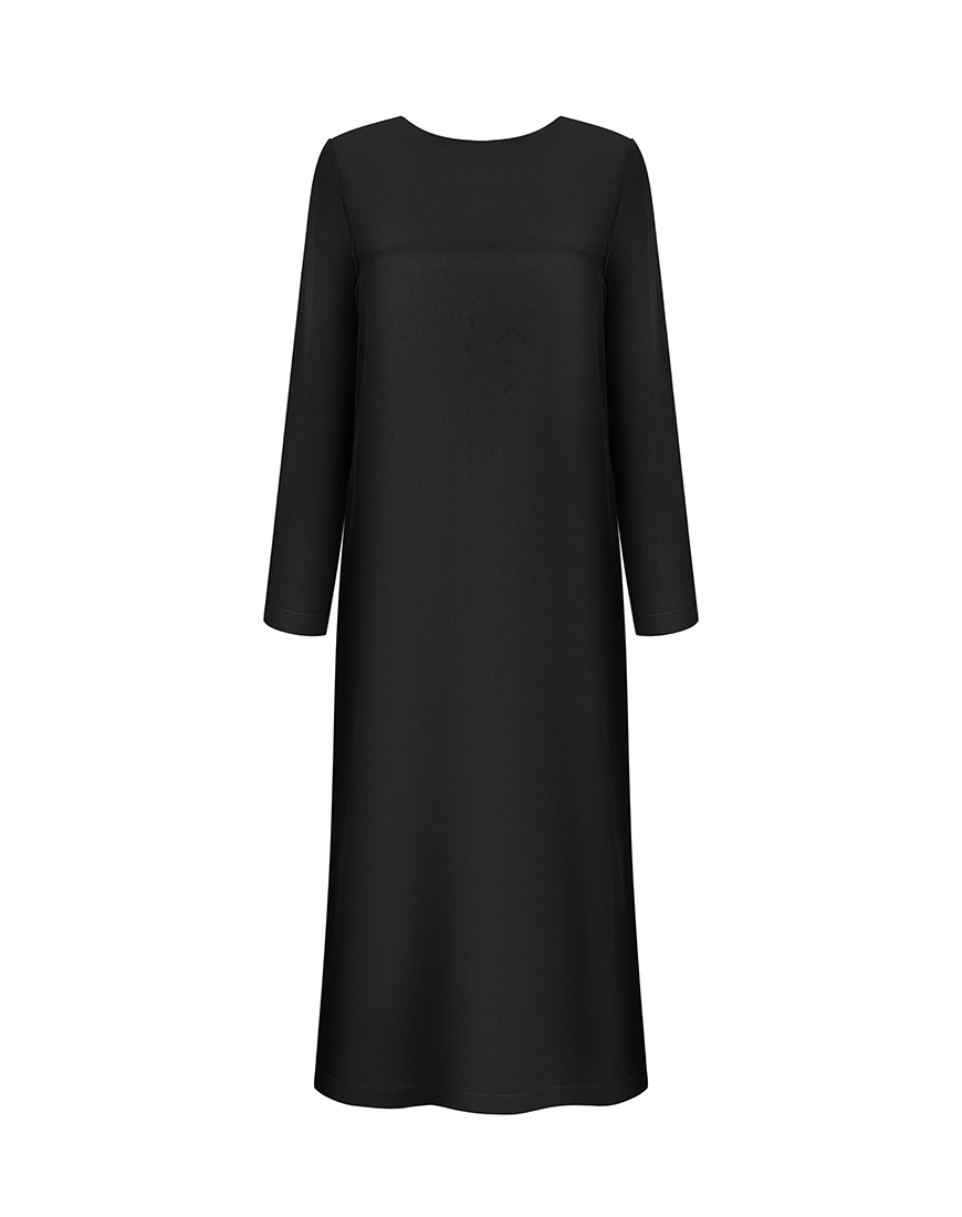 Стиль — класичний. Силует — прямий, вільного крою плаття. Спереду — горловина закрита, кругла. На спинці — горловина V-подібна, відкрита. У бокових швах — кашельки. По середньому шву спинки — розріз. Рукав довгий, одношовний. Довжина сукні від плеча — 135 см, довжина рукава — 63 см.