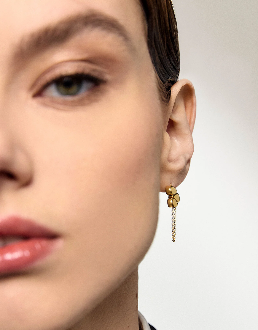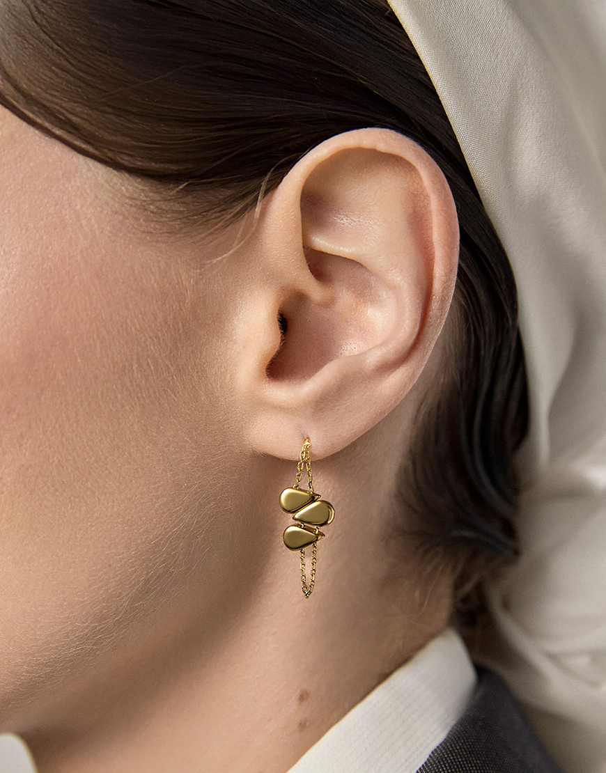 Зважай, що ширший край намистини міцно фіксується на ланцюгу, а носик вільно коливається, що може створювати між елементами дихаючий простір чи легку асиметрію. Так і задумано – саме це інженерне рішення дозволяє нам робити сережки такими тендітними.