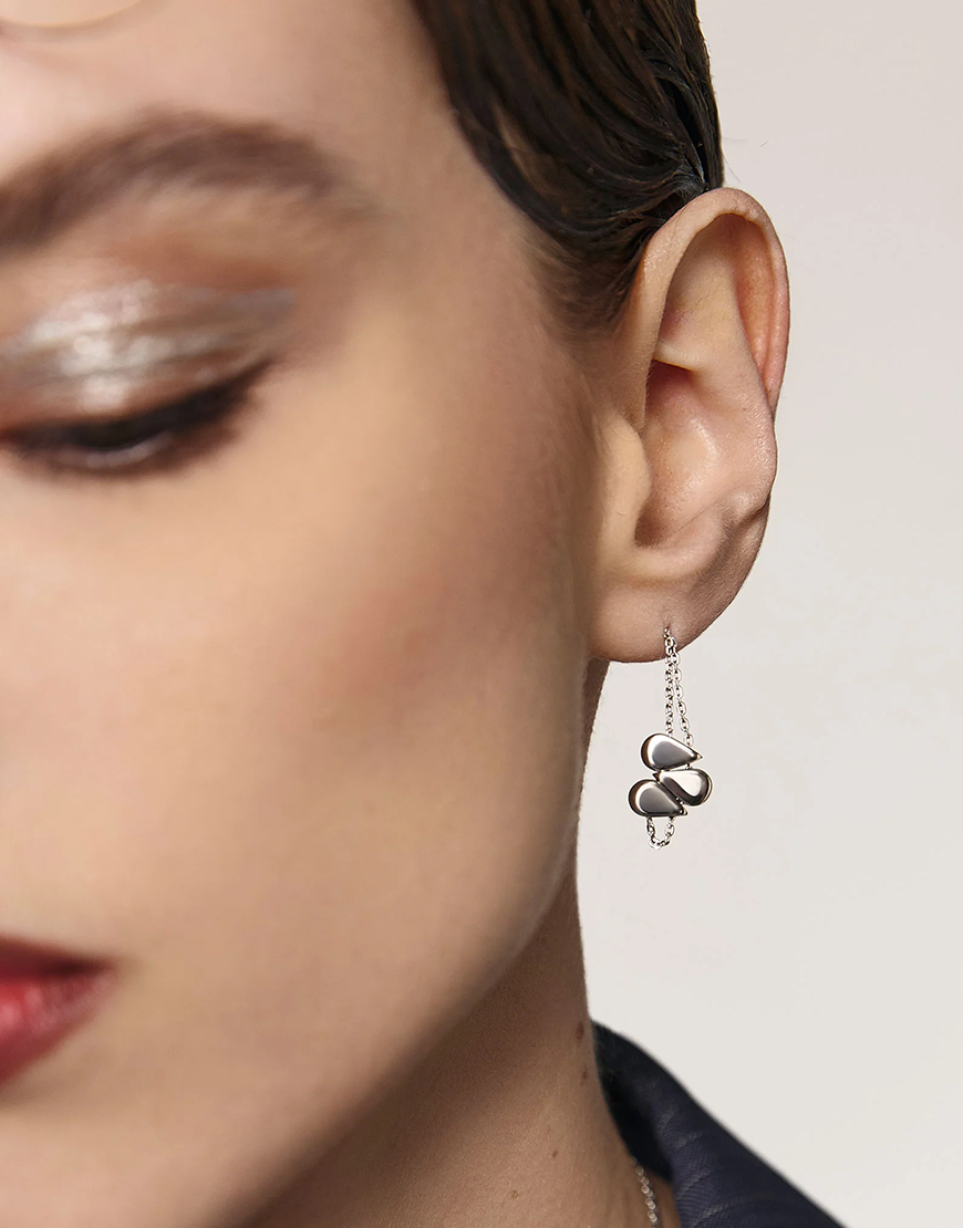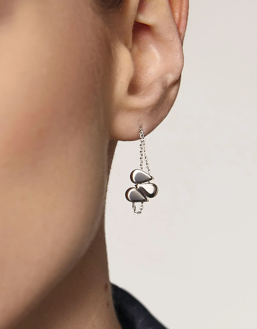 Зважай, що ширший край намистини міцно фіксується на ланцюгу, а носик вільно коливається, що може створювати між елементами дихаючий простір чи легку асиметрію. Так і задумано – саме це інженерне рішення дозволяє нам робити сережки такими тендітними.