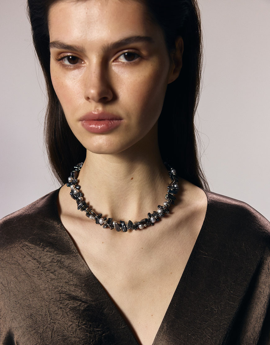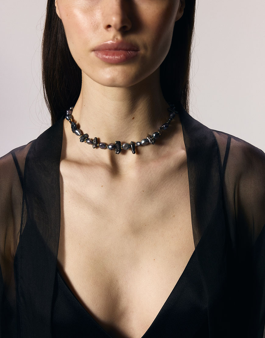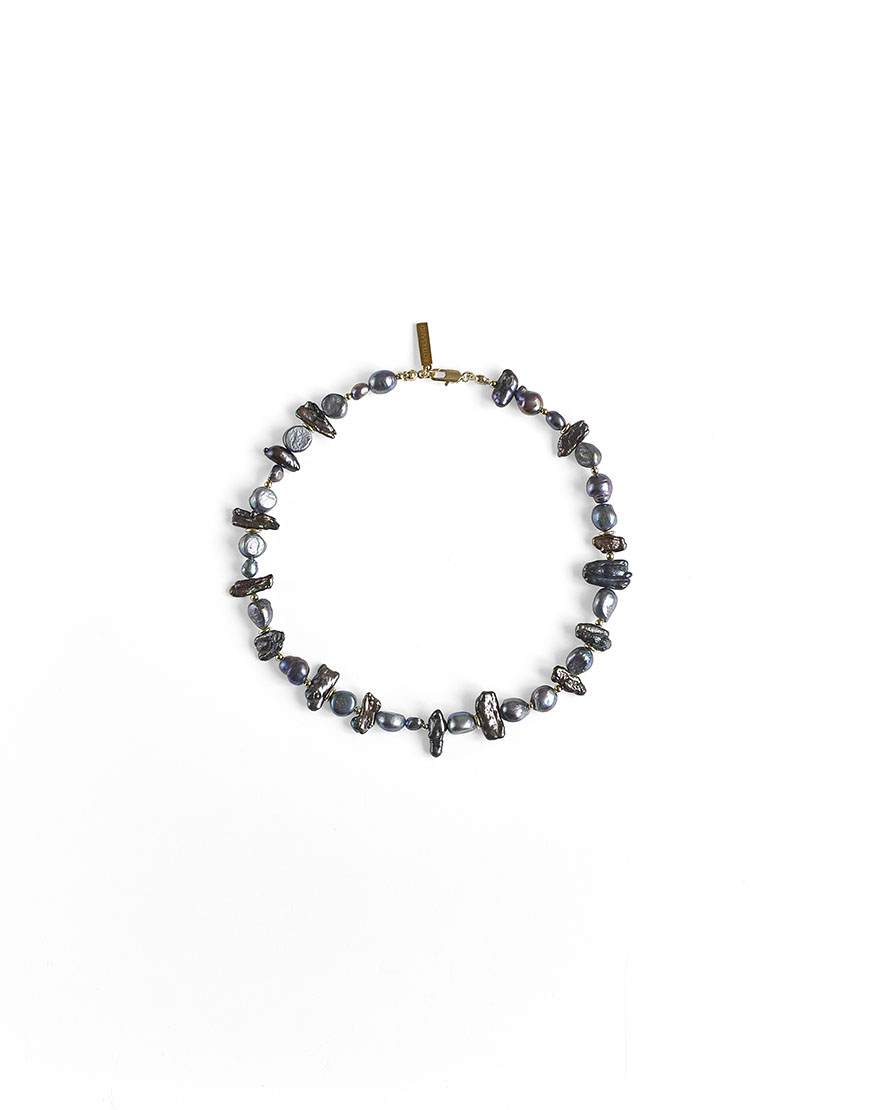 Доставка впродовж 3-5 робочих днівКольє – чокер з натуральних річкових перлин кеші темного кольору – декілька форм та розмірів в одному кольє.