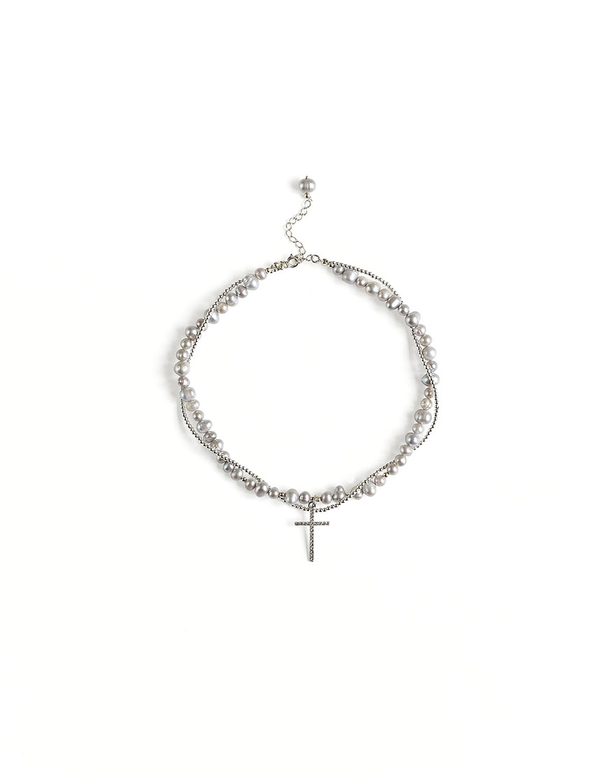 Доставка впродовж 3-5 робочих днівКольє – чокер з натуральних річкових перлин сірого кольору та гематиту. Хрестик повністю інструктований фіанітами. Натуральні перлини, срібло 925. Застібка – срібло 925, хрестик – посріблена латунь. Основа – спеціальний ювелірний трос, який тримає форму, при цьому приймаючи форму вигинів тіла, що забезпечує гарну посадку на будь якому варіанті довжини кольє