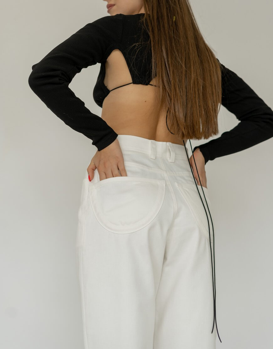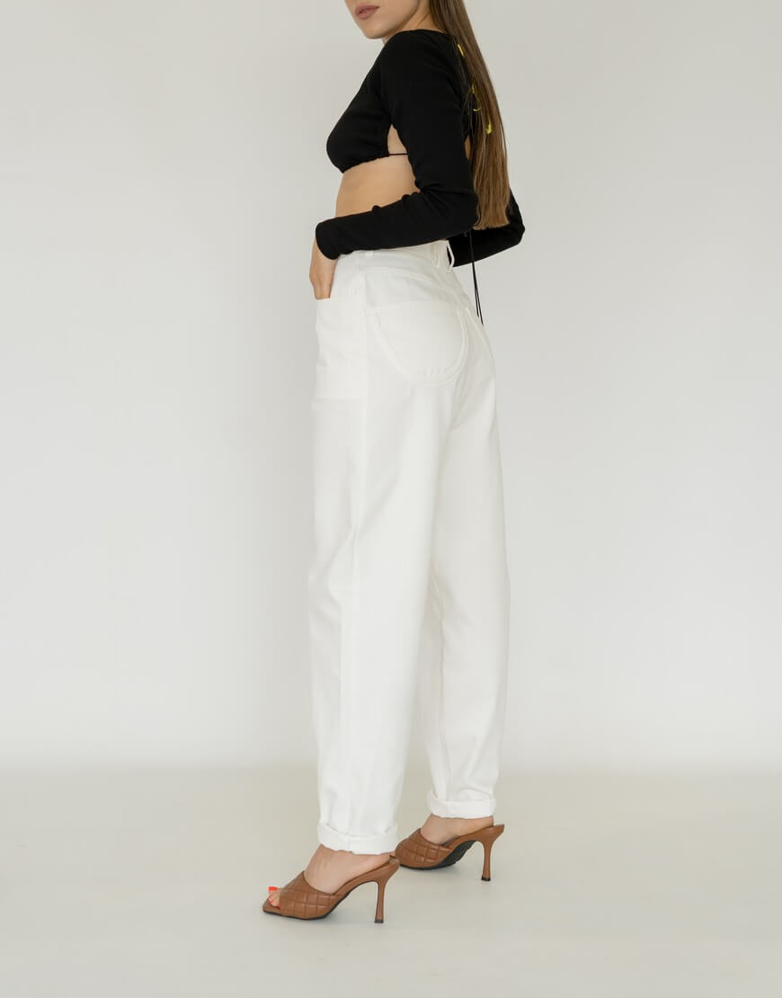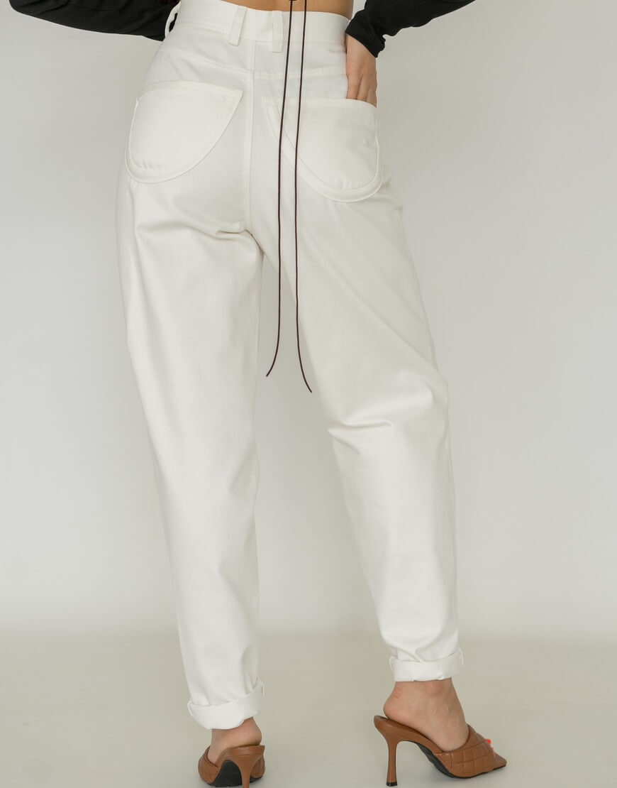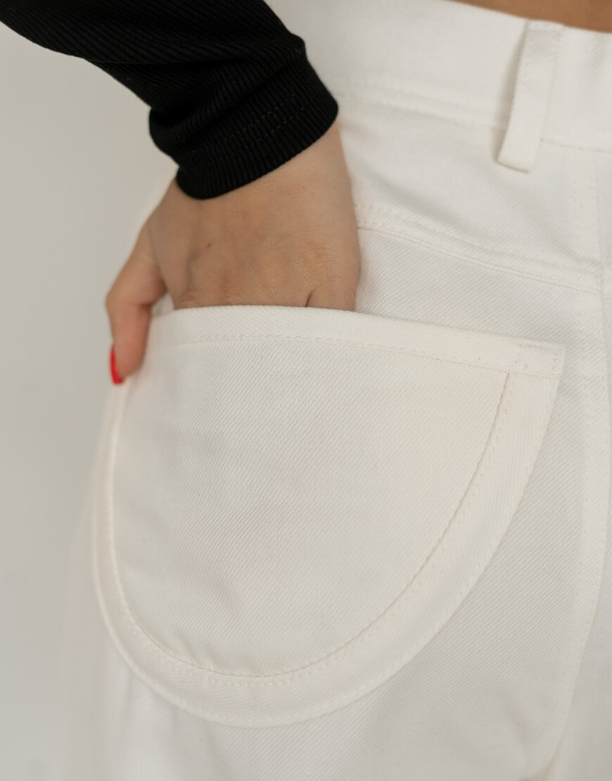 Джинси, класичні банани, виконані зі 100% деніму, без стрейчу. Висока посадка, асиметрична застібка на блискавку. Дві бічні кишені, дві задні накладні кишені.