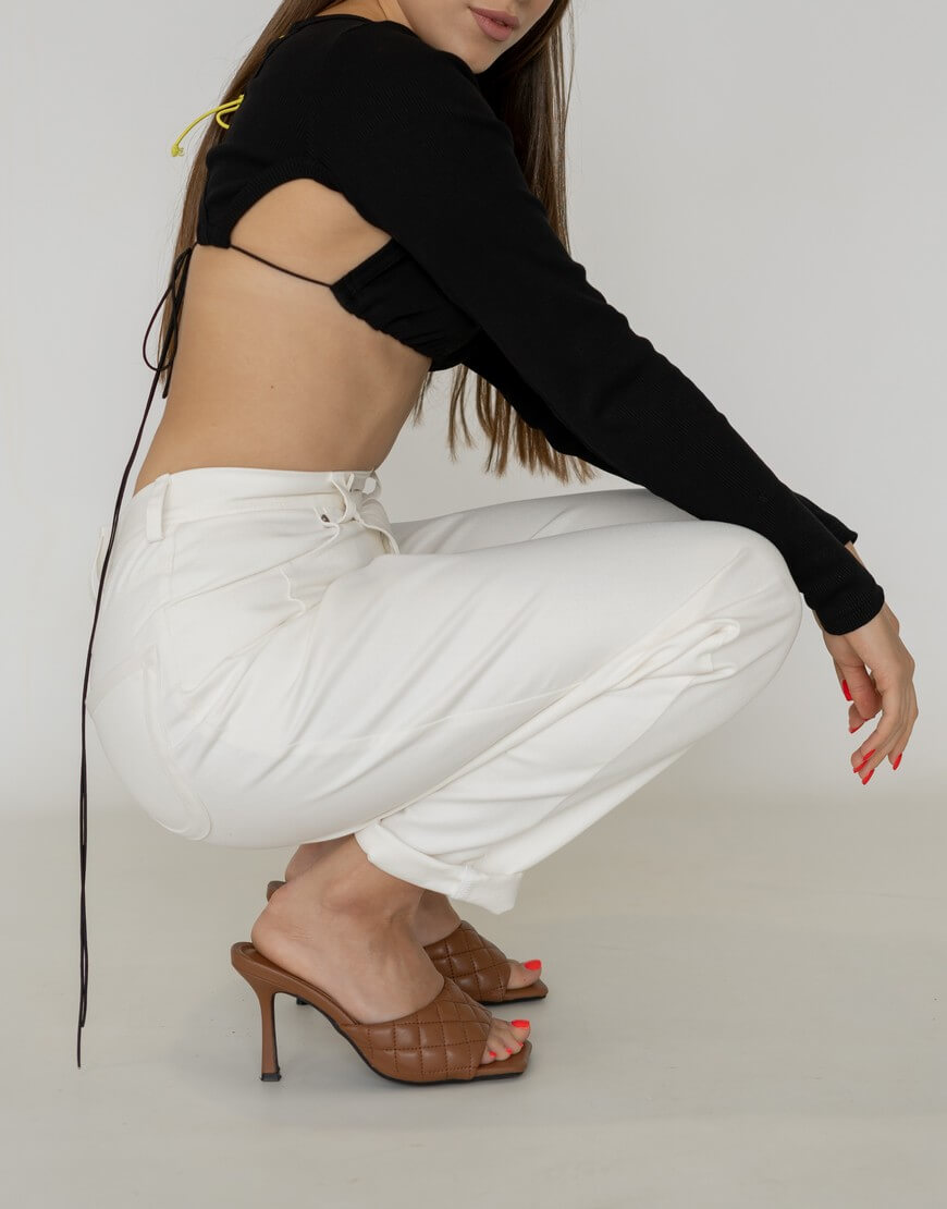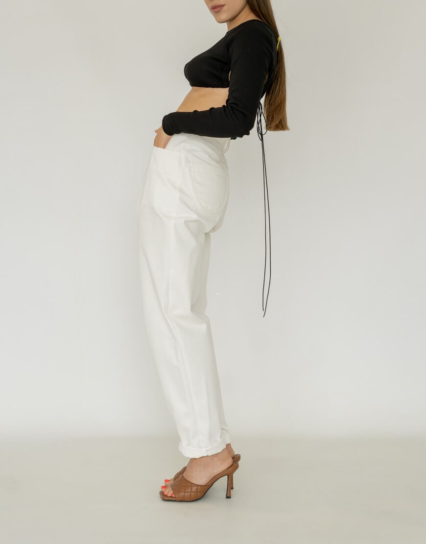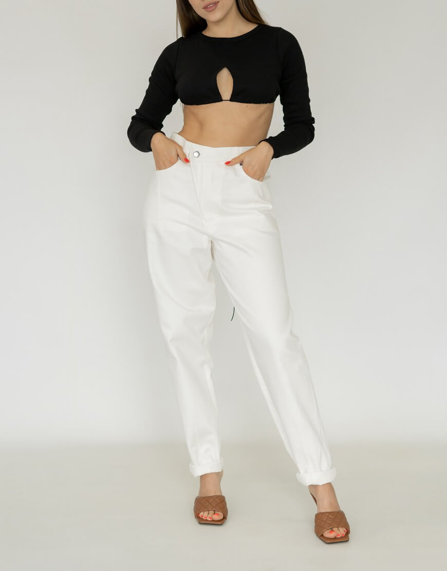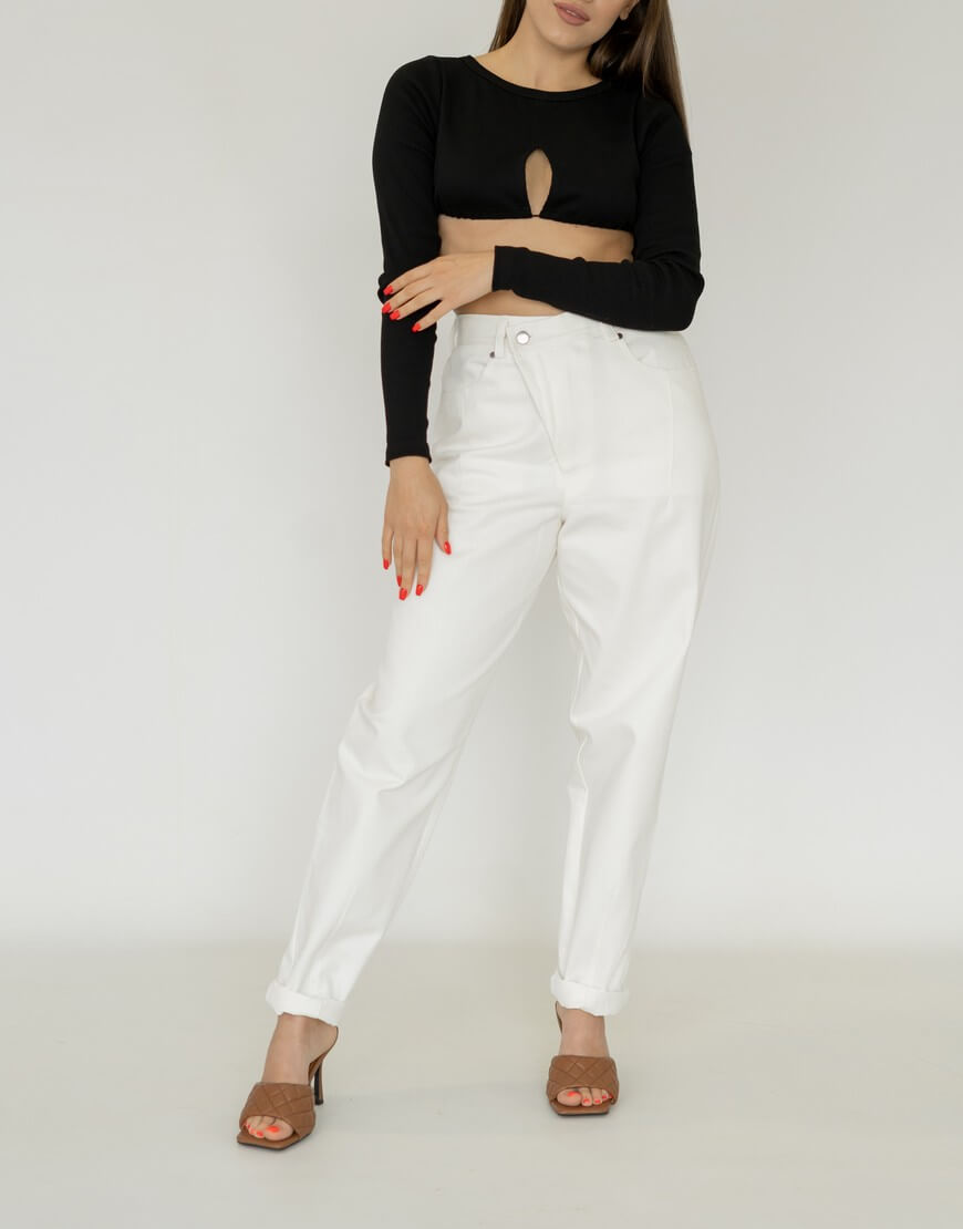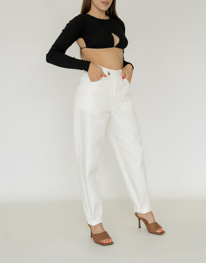 Джинси, класичні банани, виконані зі 100% деніму, без стрейчу. Висока посадка, асиметрична застібка на блискавку. Дві бічні кишені, дві задні накладні кишені.
