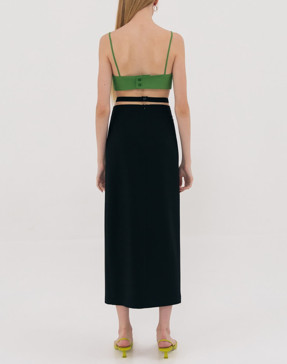 Найпровокаційніший фасон спідниці в новому сезоні обзавівся вирізами на талії. Вузька спідниця-олівець, що облягає стегна, з розрізом попереду. Ззаду застібається на блискавку, пояс застібається на гудзик. Довжина виробу 92 див, довжина розрізу 57 див.