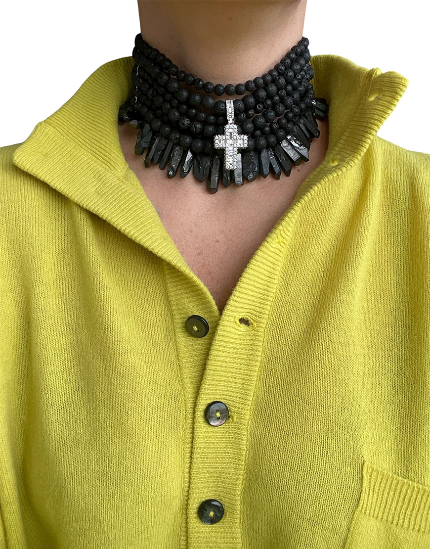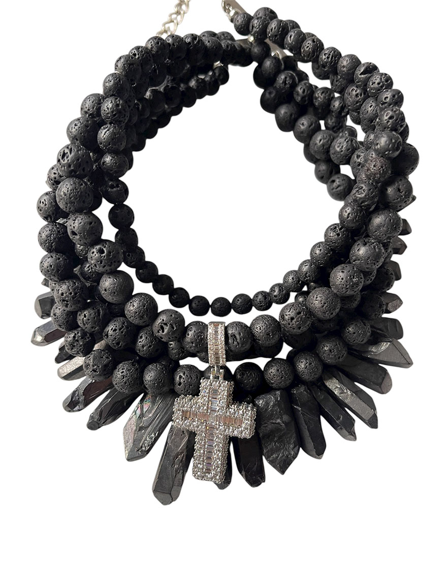Доставка впродовж 2-5 робочих днівЧоке виготовлений із натурального каміння, прості намистини лави поєднані з виразним кварцем. Центральний елемент – хрест із цирконієм, який додає яскравий акцент.
