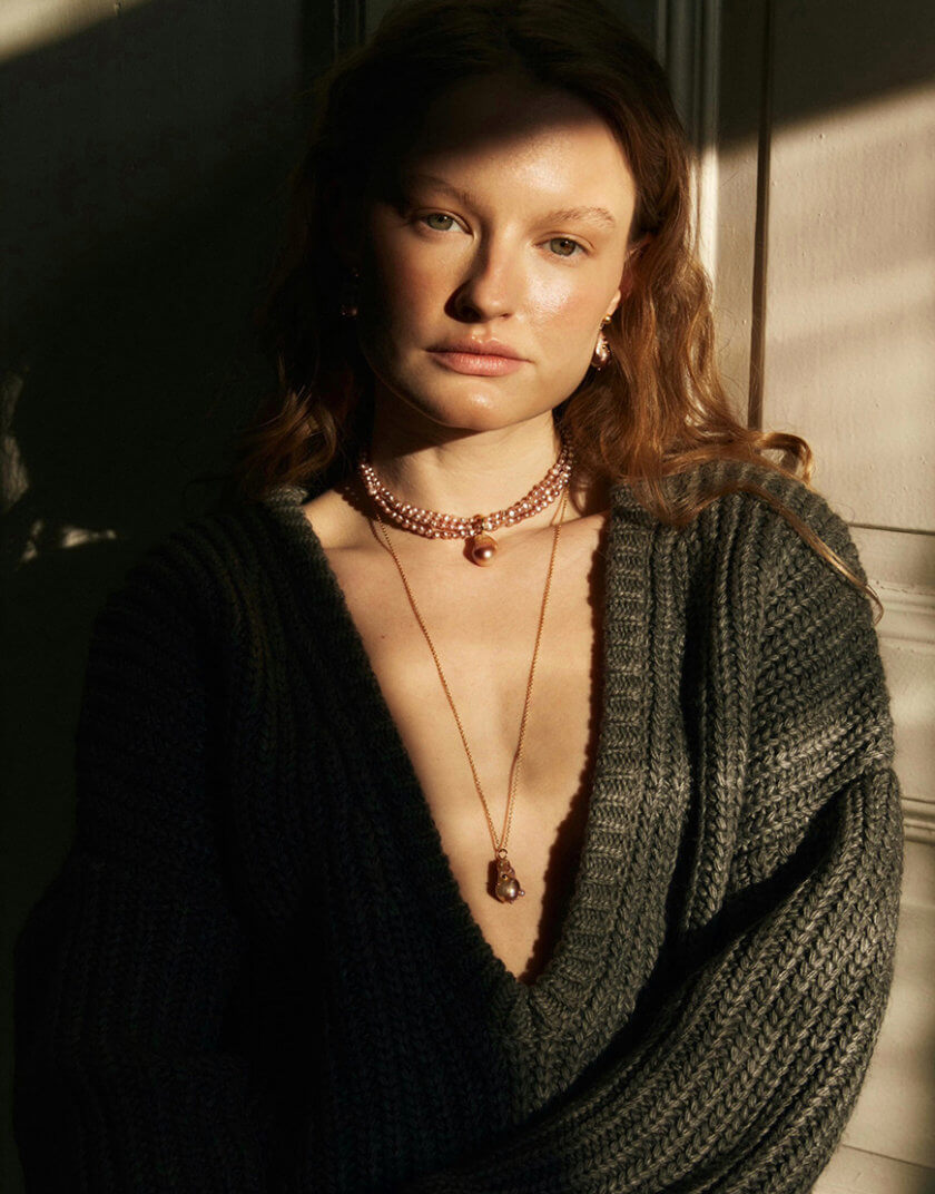 Намисто з трьох низок пурпурових перлин зі з’ємним підвісом з барокової перлини.