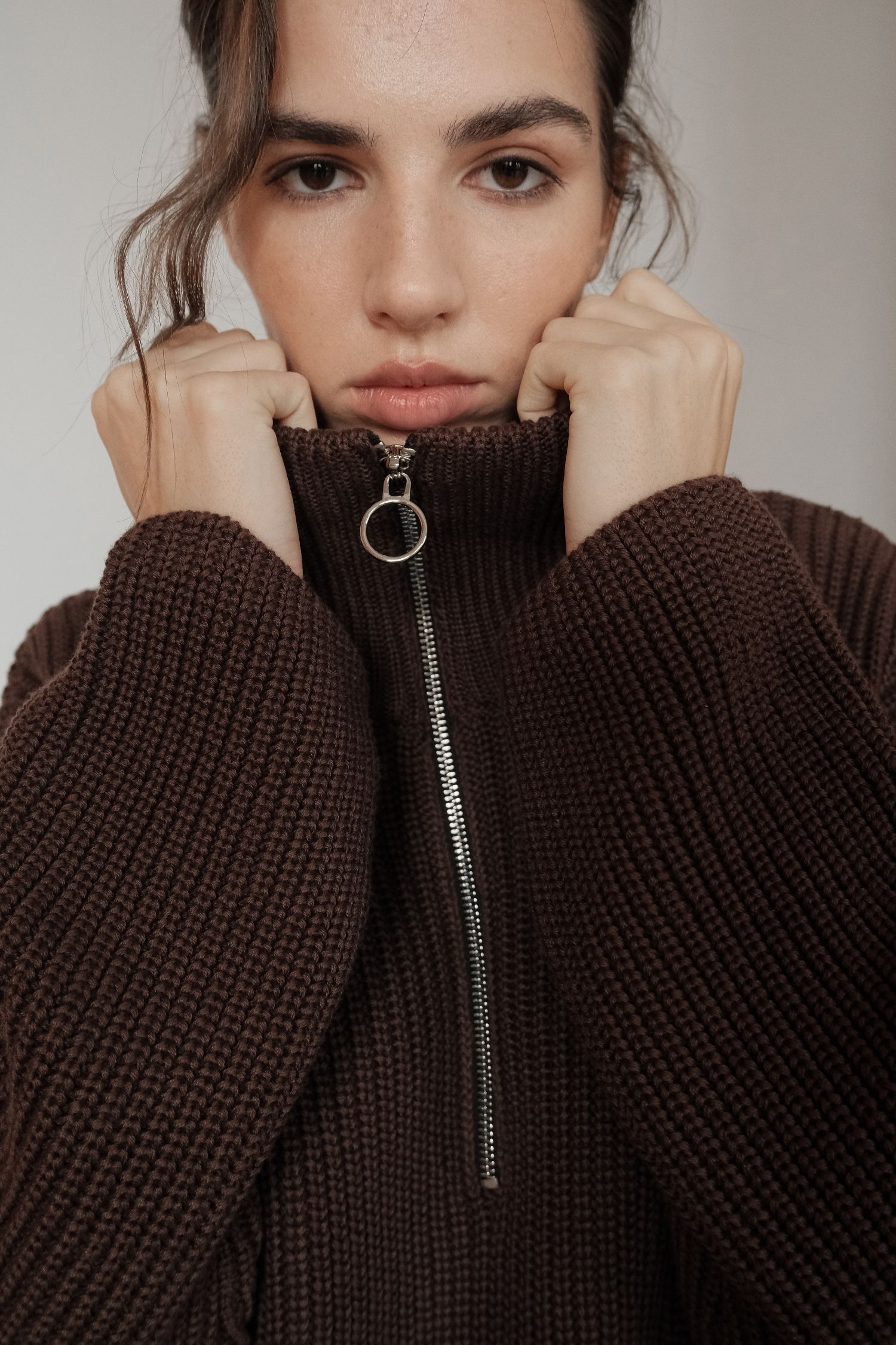 ДоставкаЖіночий трикотажний светр шоколадного відтінку, виготовлений із 100% бавовняної нитки. Фасон оверсайз з високим коміром, що застібається на блискавку. М’який на дотик і комфортний у носінні. Теплий і затишний варіант для щоденного використання, який добре поєднується зі спідницею, брюками або джинсами.