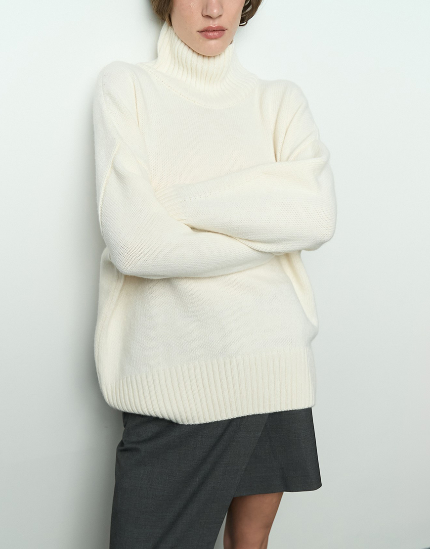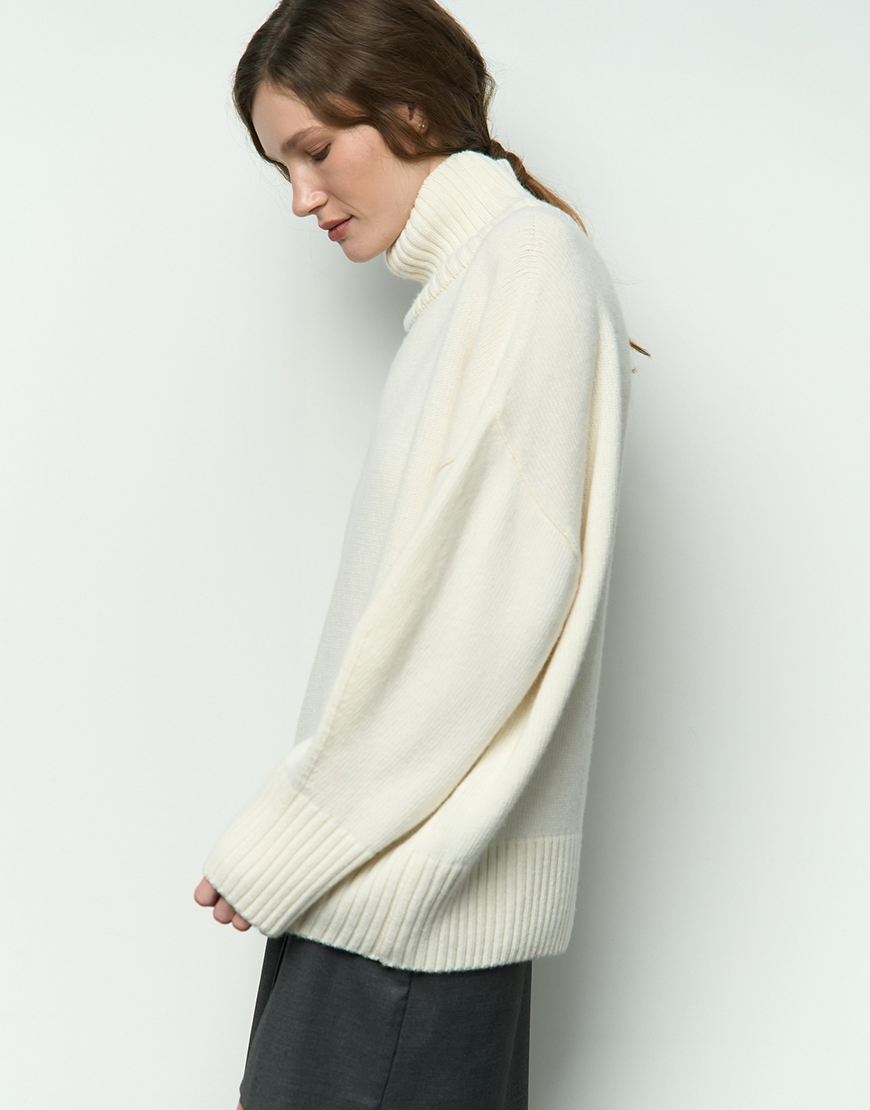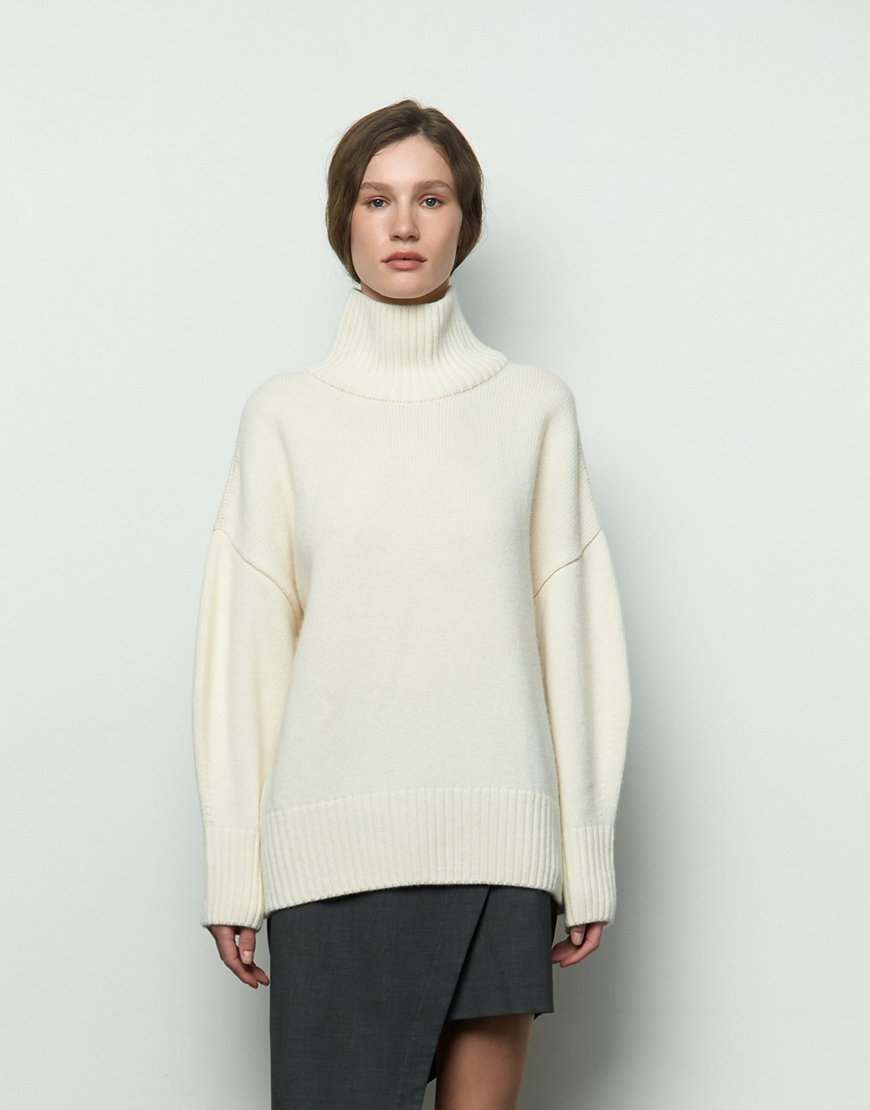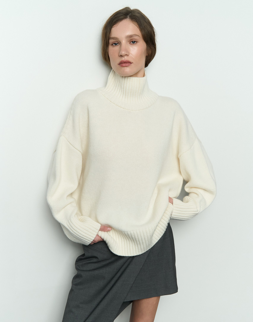 Mellow з високою горловиною. Матеріал цієї моделі – високоякісна вовна з невеликим відсотком віскози та поліаміду, завдяки чому гарно виріб тримає форму, має чудові теплоізоляційні властивості та гарну зносостійкість. Светр виконаний гладкою