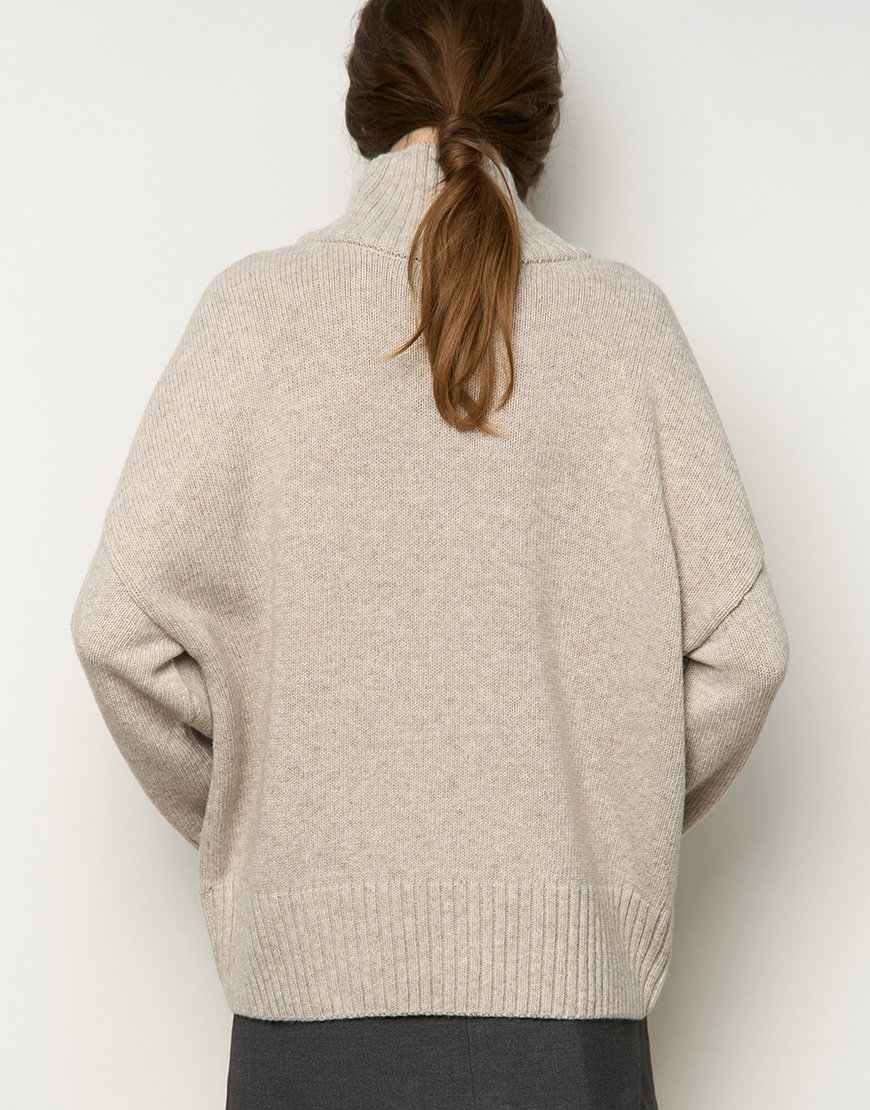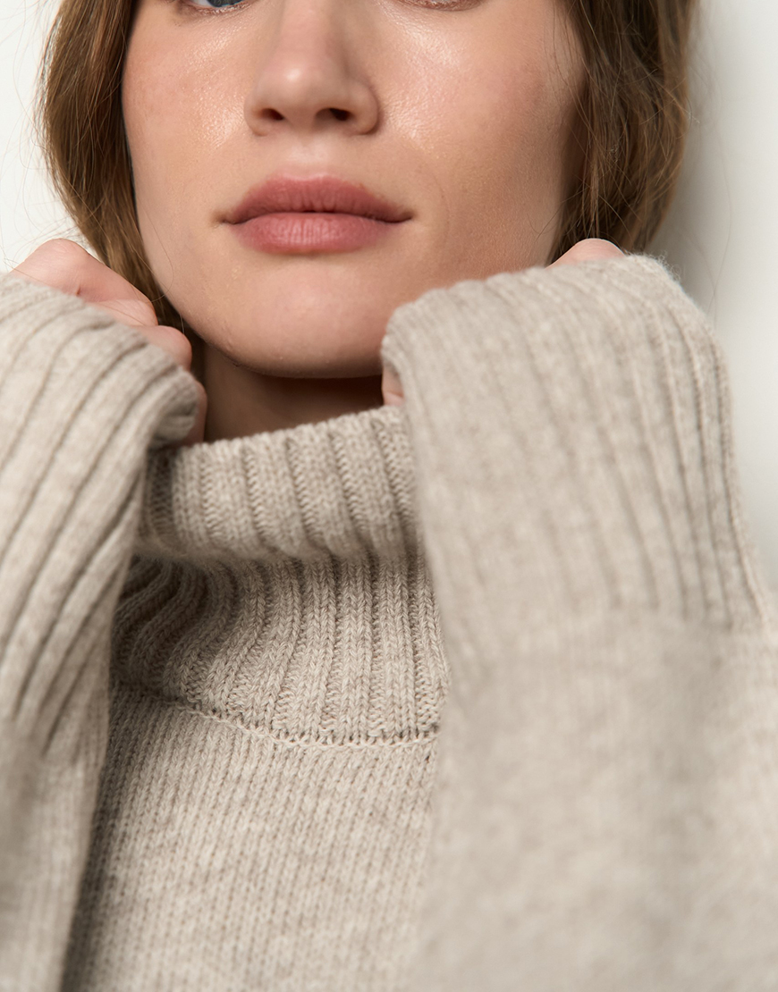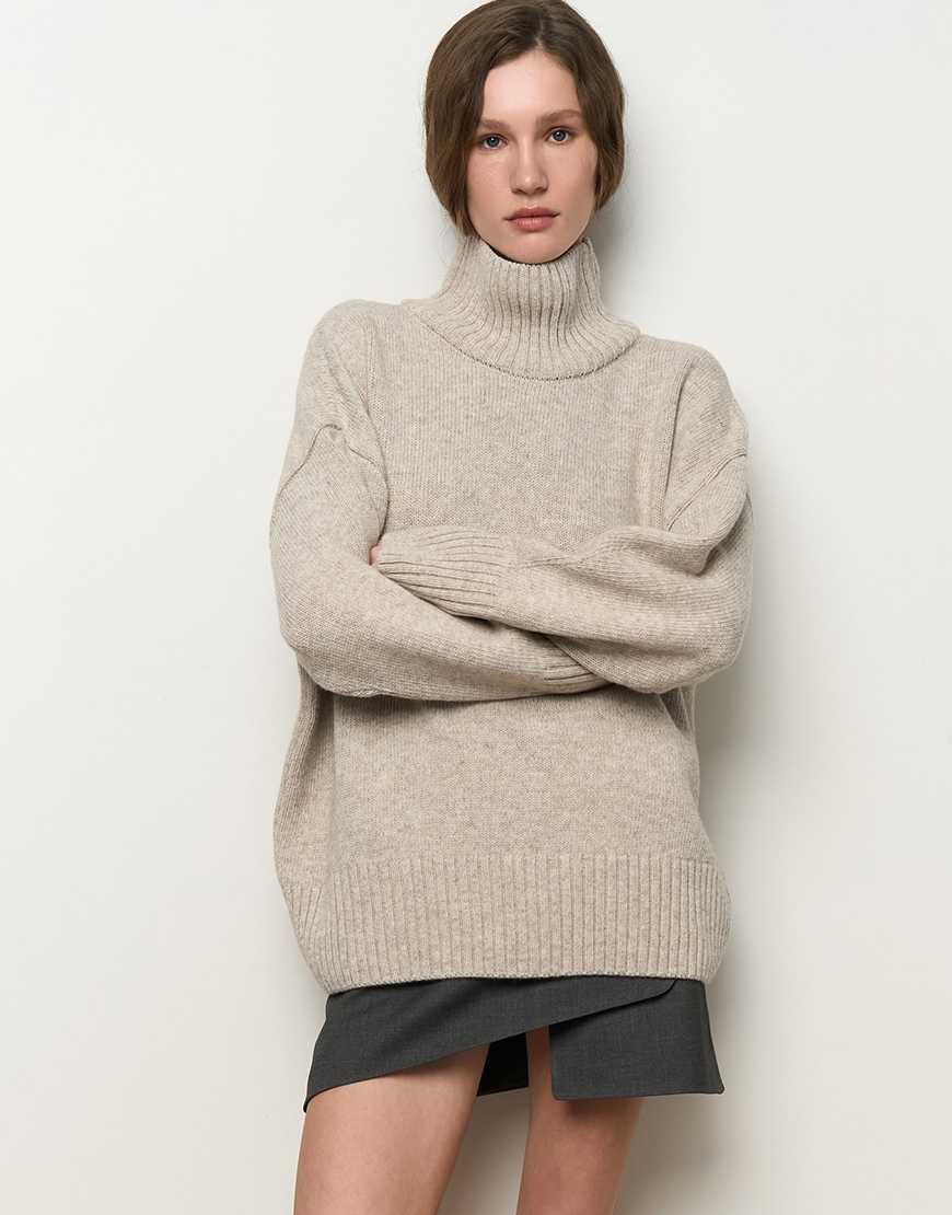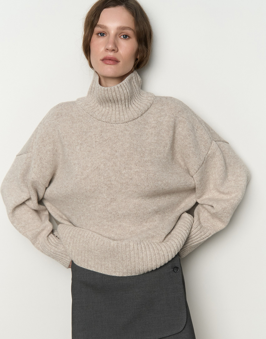 Mellow з високою горловиною. Матеріал цієї моделі – високоякісна вовна з невеликим відсотком віскози та поліаміду, завдяки чому гарно виріб тримає форму, має чудові теплоізоляційні властивості та гарну зносостійкість. Светр виконаний гладкою