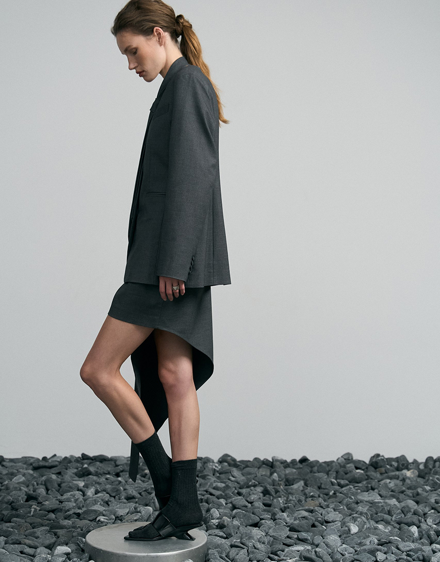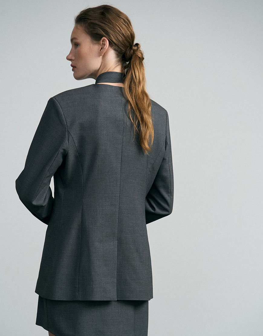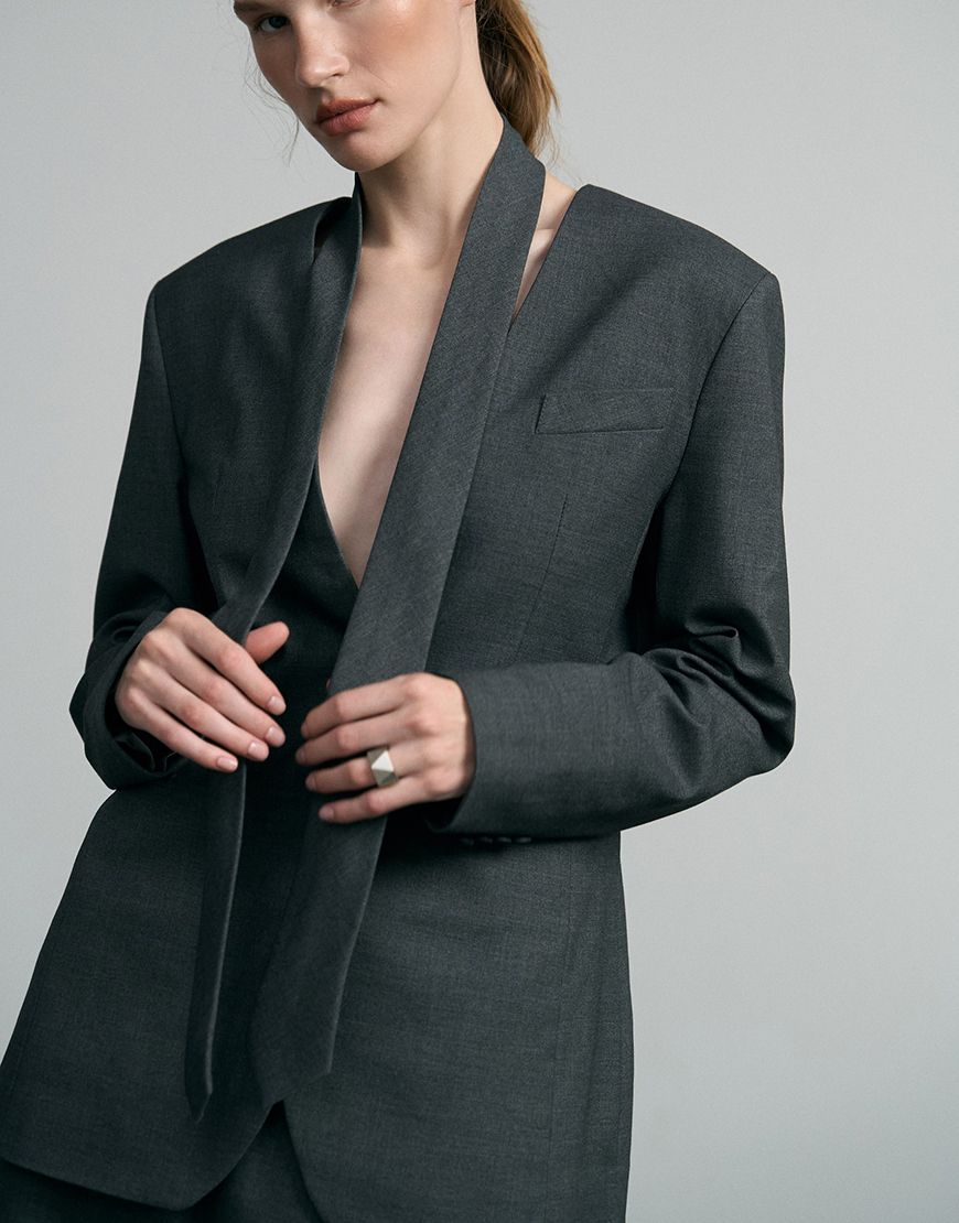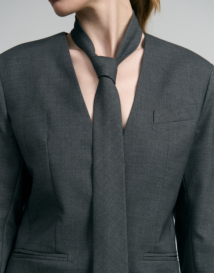 втілює спокійну естетику чистих ліній та форм. Класичний крій довершений мінімалістичним трикутним вирізом без коміра та краваткою, яку можна носити у звичний спосіб, як пояс на талії та в якості