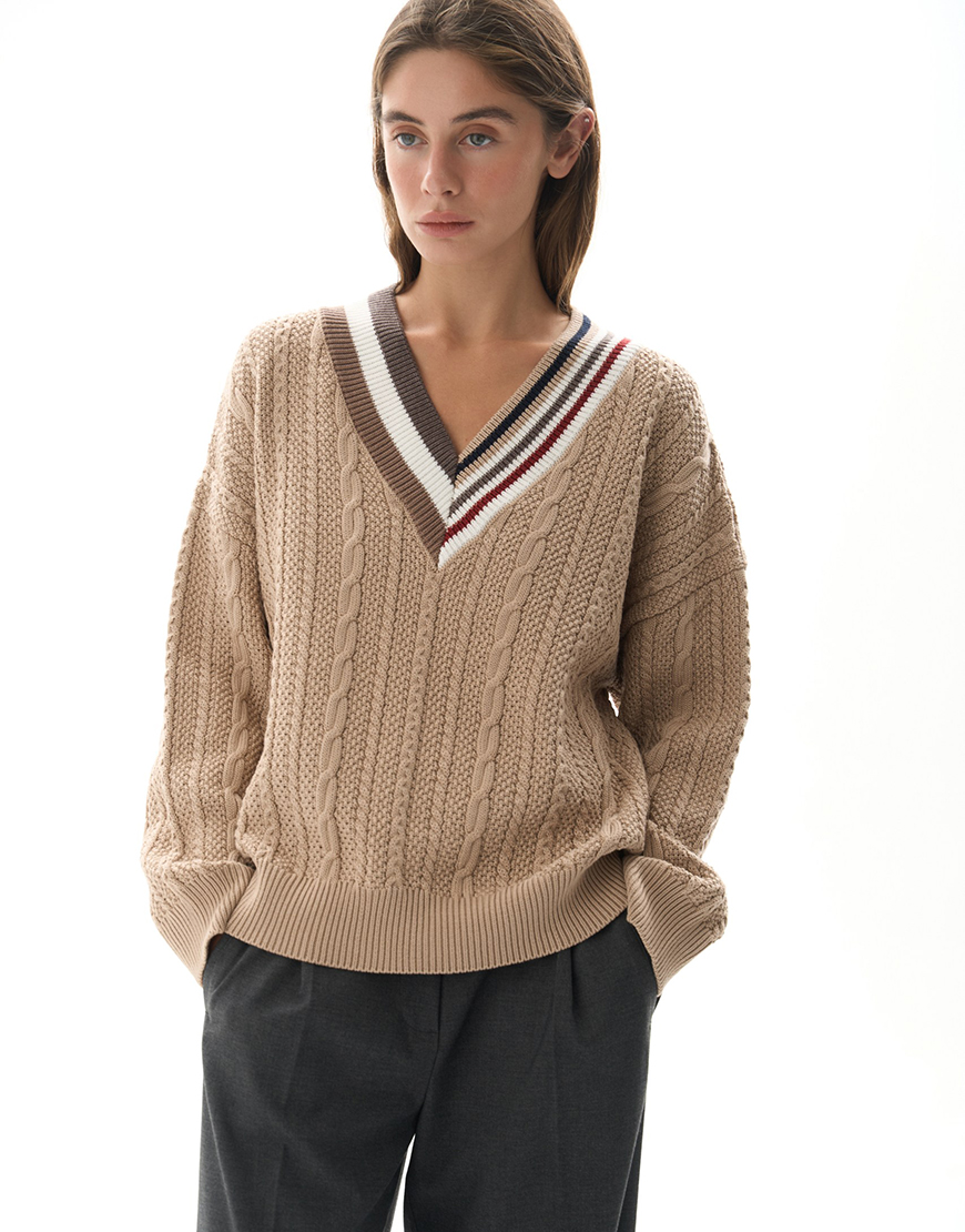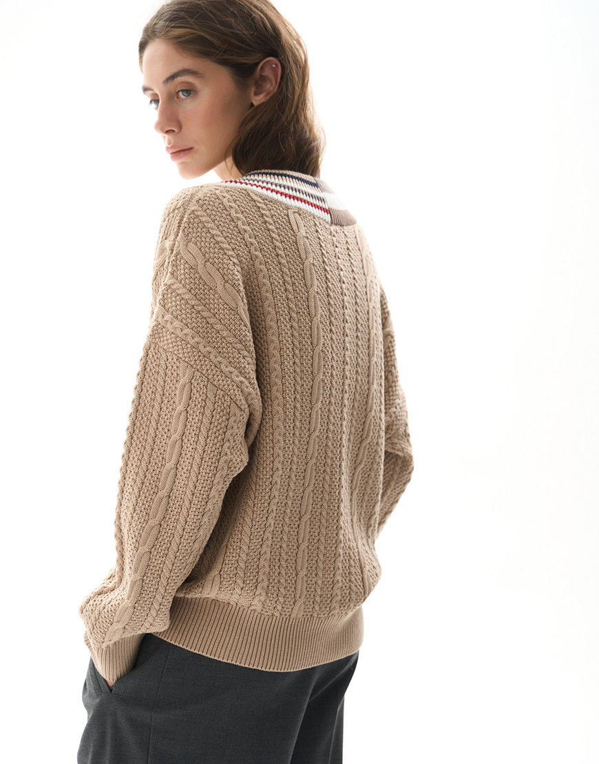 Светр вільного крою, виконаний у плетінні «коси» з акцентною горловиною мис, стане чудовим вибором для створення стильного та затишного образу.