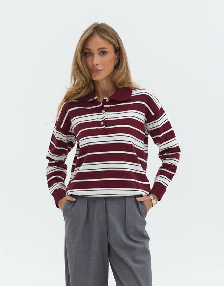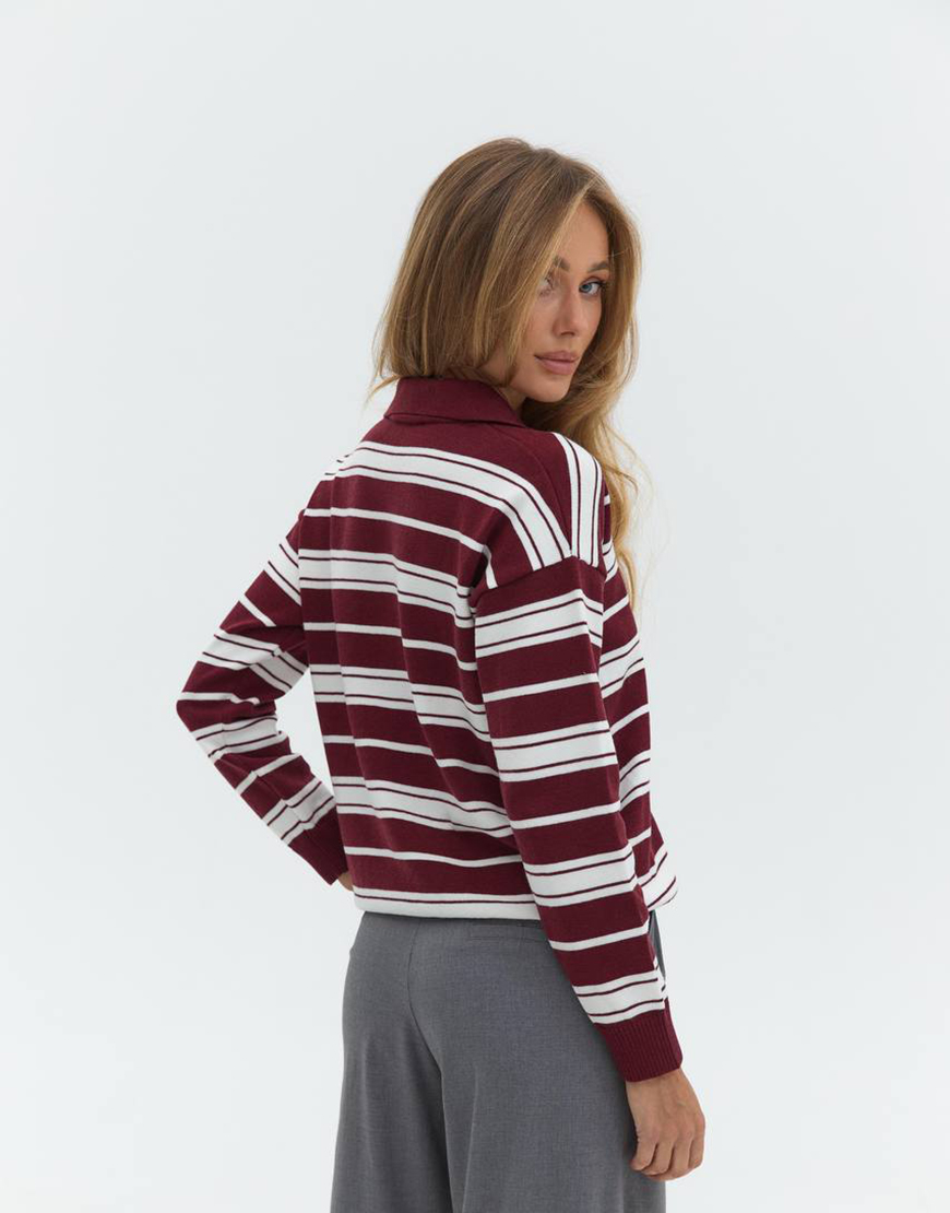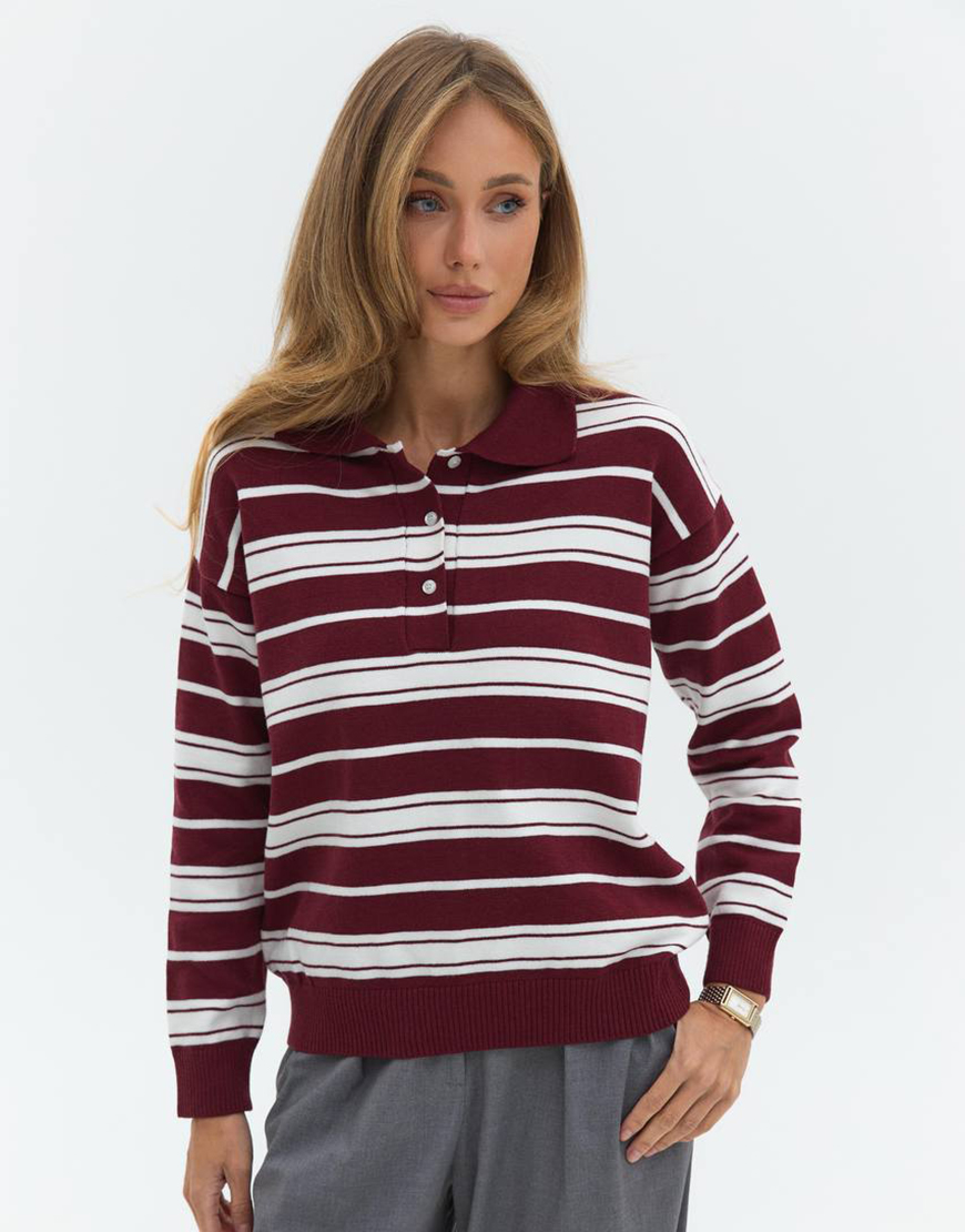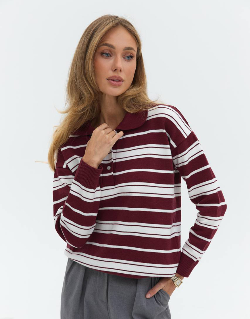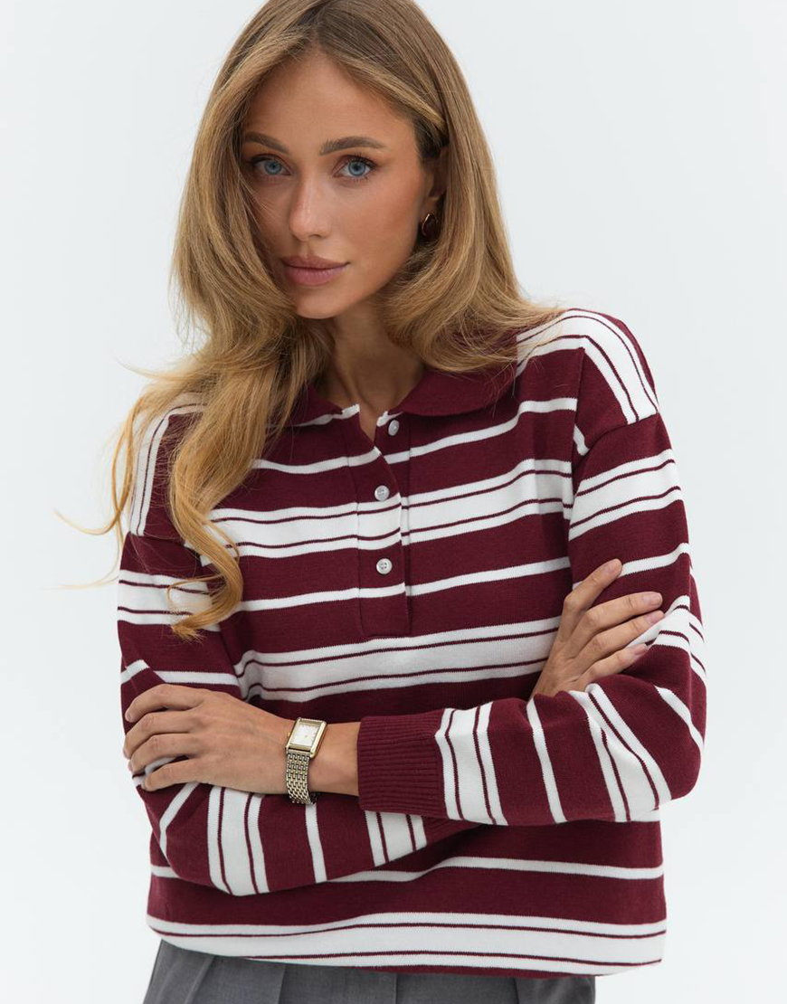Доставка впродовж 5-7 робочих днівДжемпер поло в смужку — ідеальний вибір для тих, хто цінує комфорт у поєднанні з ретро-естетикою. Завдяки змішаному складу, джемпер приємний до тіла, теплий, еластичний, не подразнює шкіру та довго зберігає свій вигляд навіть при частому носінні. Ідеально впишеться як у базовий гардероб, так і в актуальні модні образи сезону.