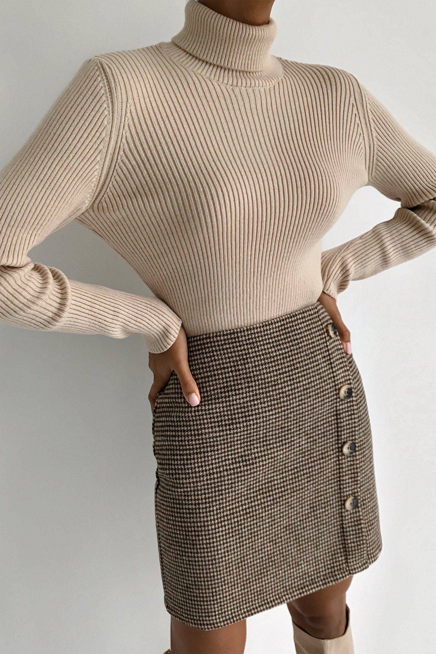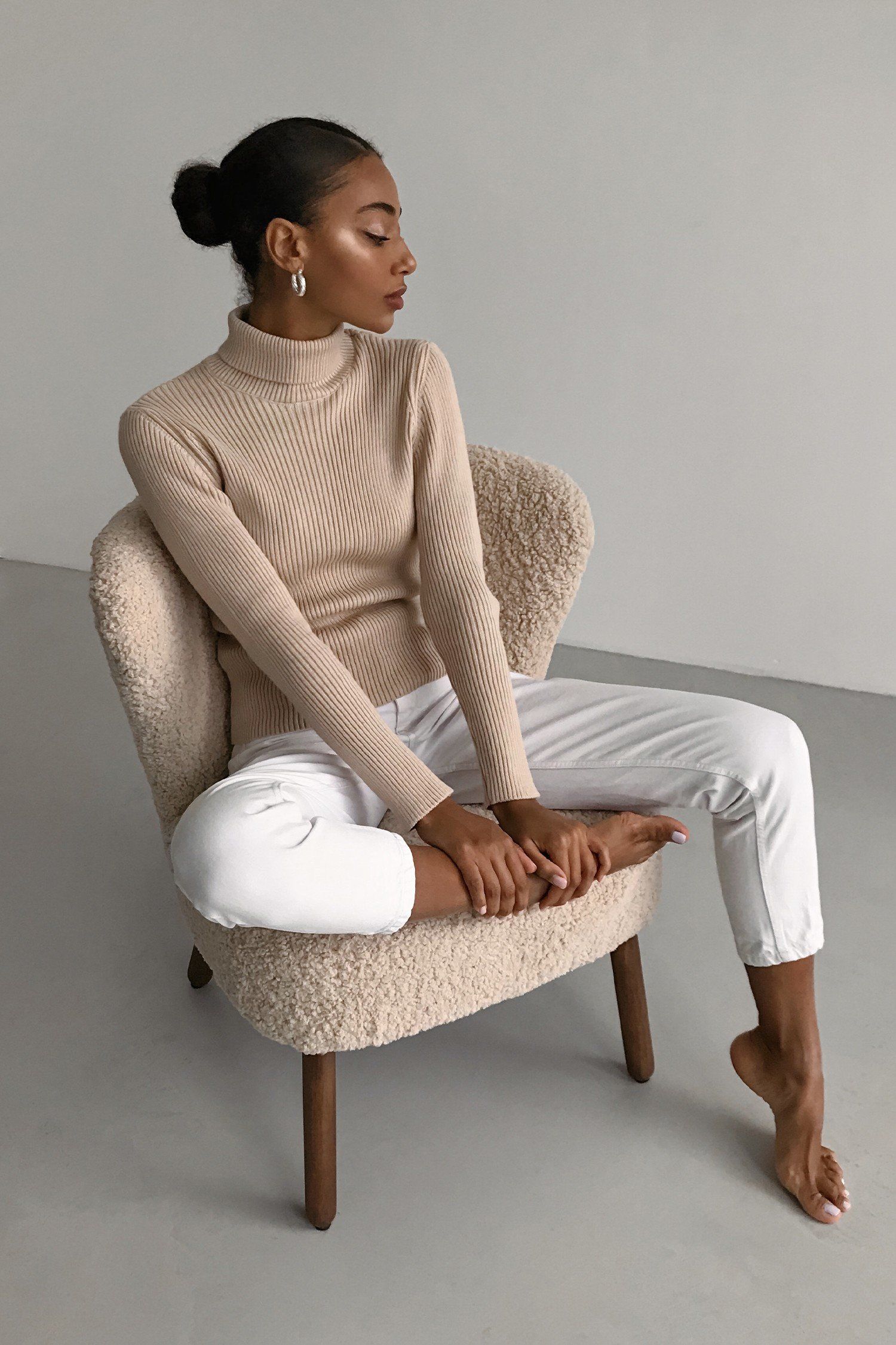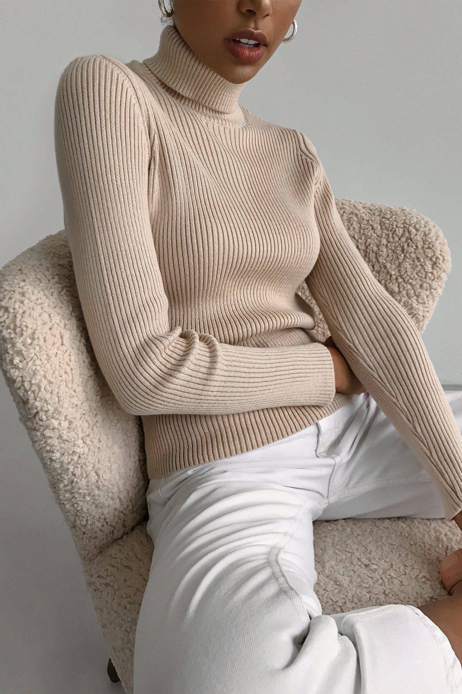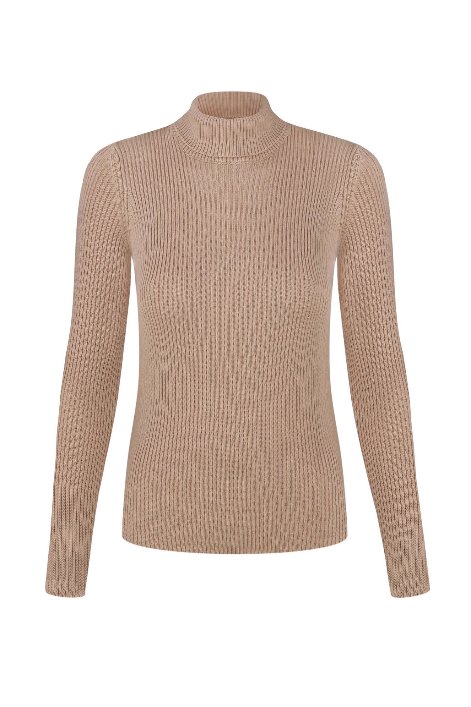 Кремова жіноча водолазка пошита зі щільного трикотажного полотна. Має приталений крій із чіткою силуетною лінією, високу горловину та рубчикову текстуру тканини. Підходить для повсякденного гардероба. Стилісти The Lace радять поєднувати її з брюками, спідницями чи джинсами.