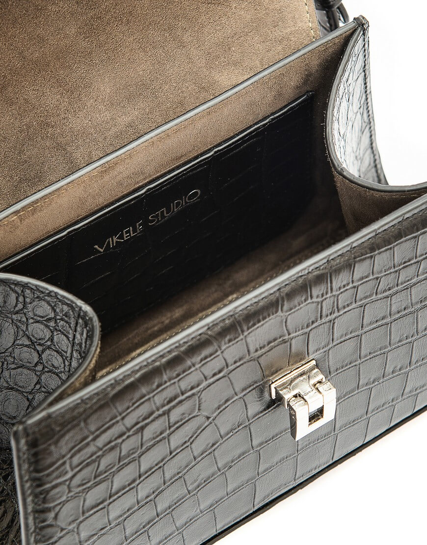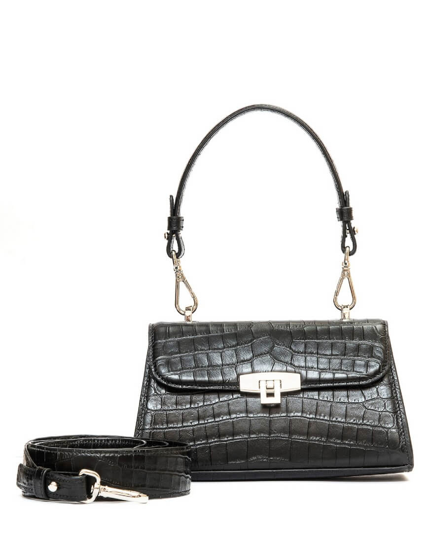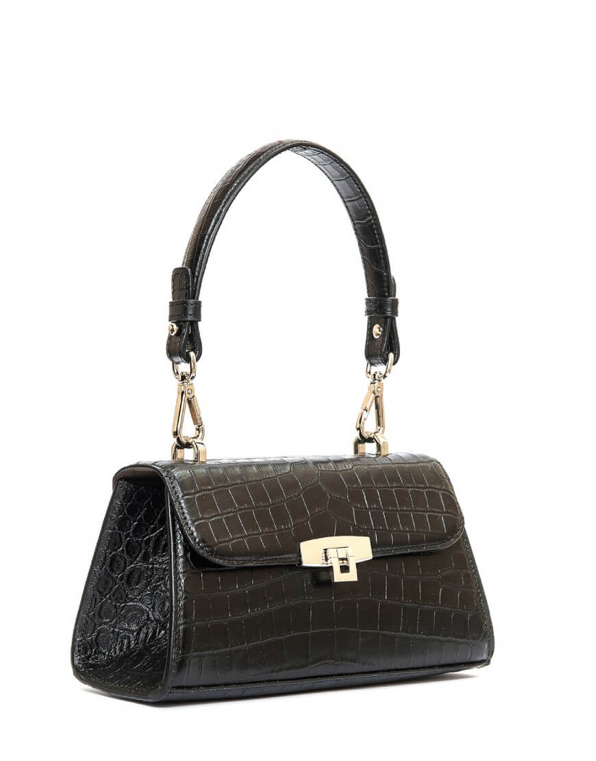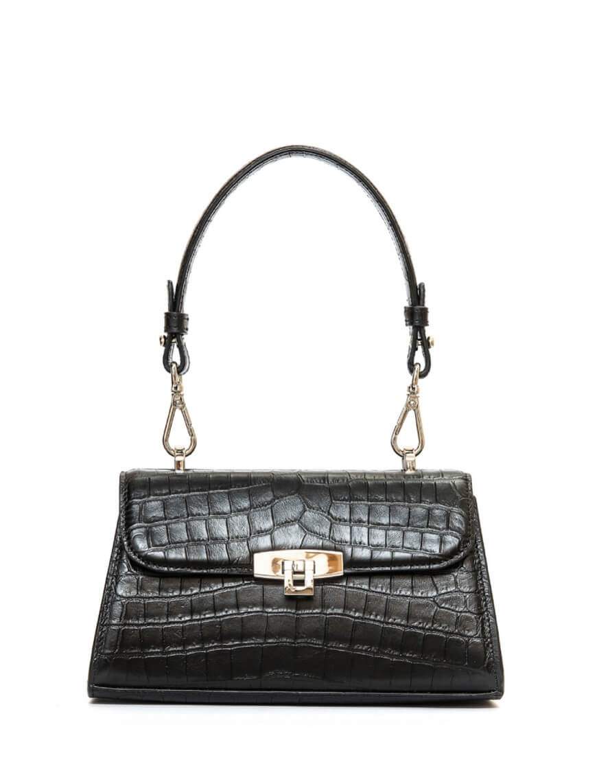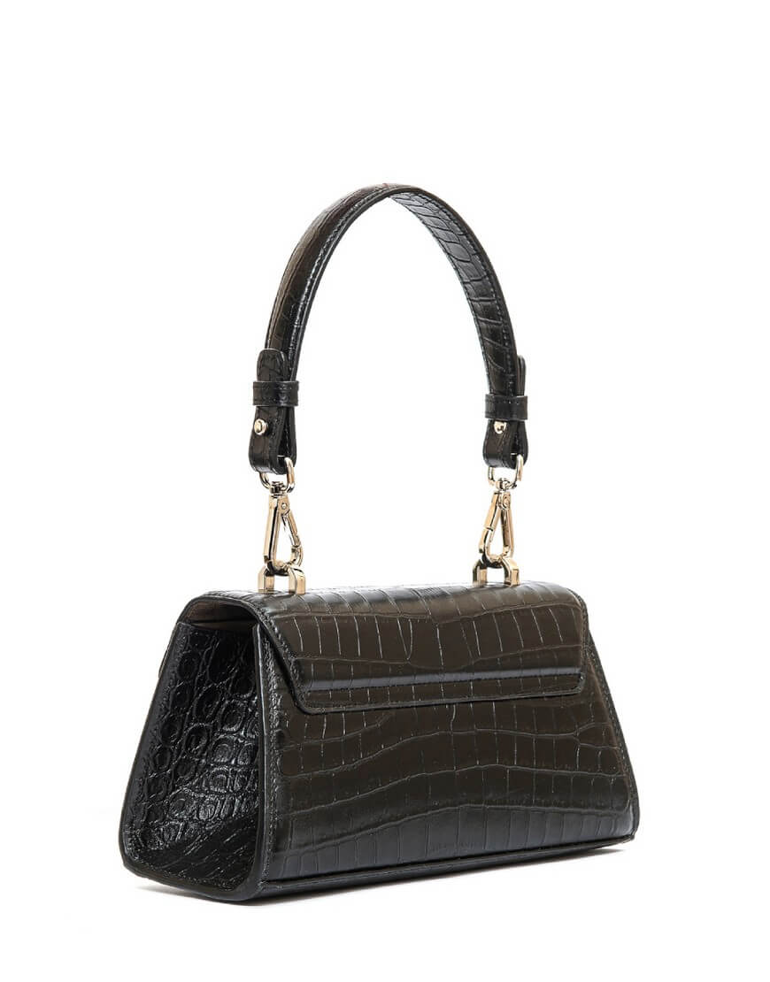 CHARLOT PETITE – чарівна сумка трапецеподібної форми з лаконічним дизайном, плавними лініями та ефектною фурнітурою. Компактний аксесуар закривається широким відкидним клапаном із поворотним замком. Він римується із карабінами на короткій ручці та зйомному довгому плечовому паску. Сумка виготовлена з гладкої щільної італійської шкіри чорного кольору. Всередині сумки є невеличка кишеня. Підкладка – натуральна шкіра (велюр).