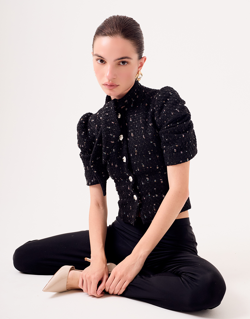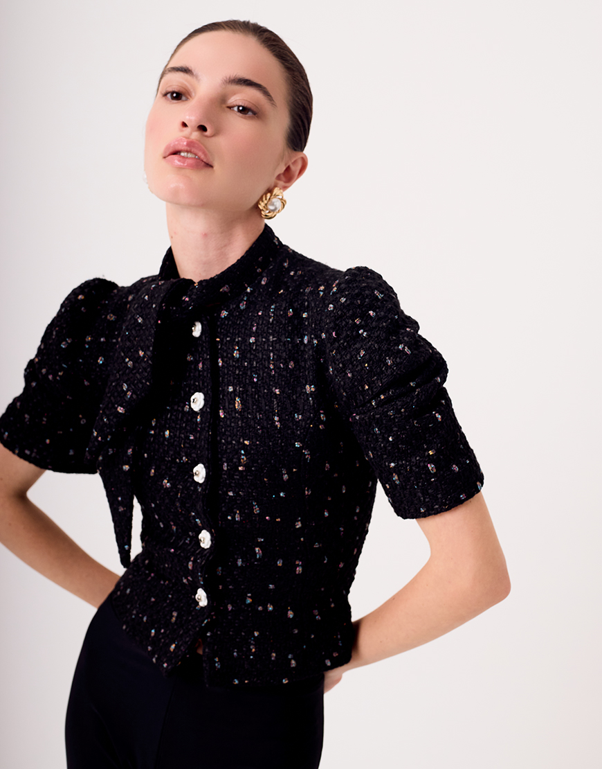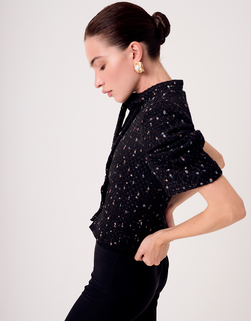 Доставка впродовж 2-9 робочих днівЦей вкорочений жакет із твіду про гру на своїх умовах.