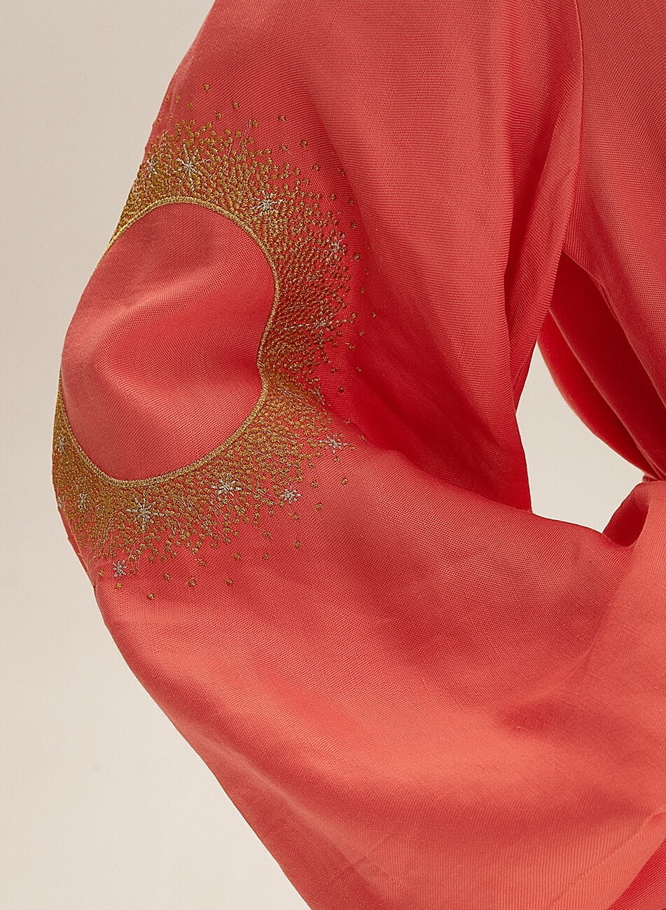 Коротка сукня на запах із кишенями в бічних швах. Рукава сукні розшиті орнаментом “Затемнення”. У комплекті пояс.