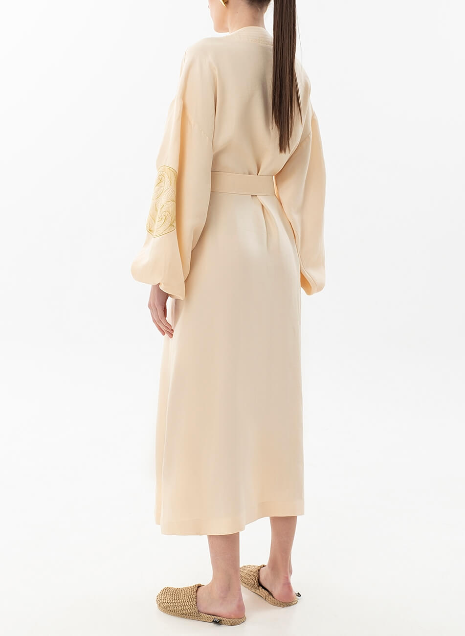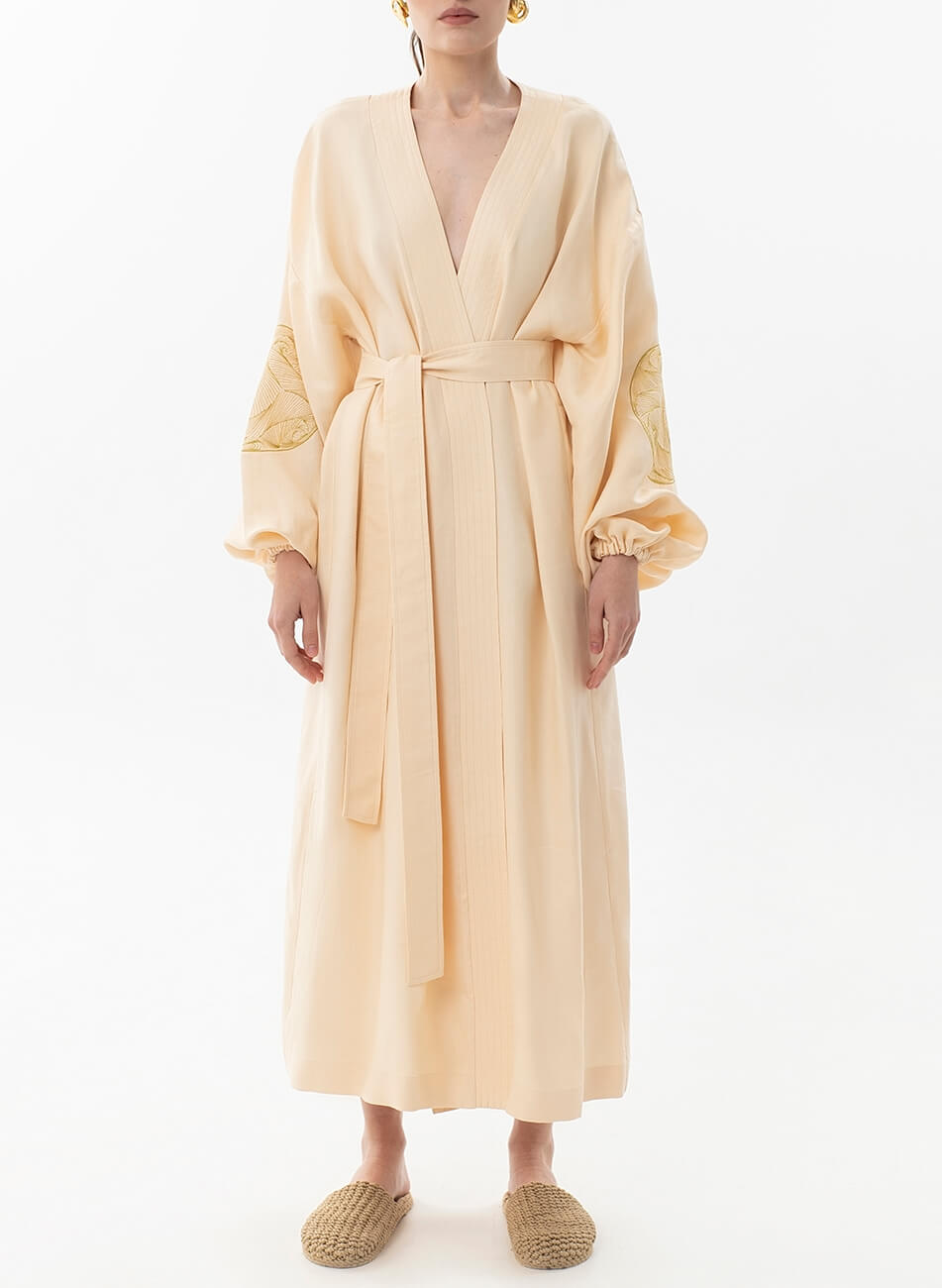 Лляне кімоно прямого крою з вишитими металізованими нитками рукавами. Вишивка на рукавах – символ української ідентичності, а також частина ДНК-бренду. У комплекті до кімоно пояс.