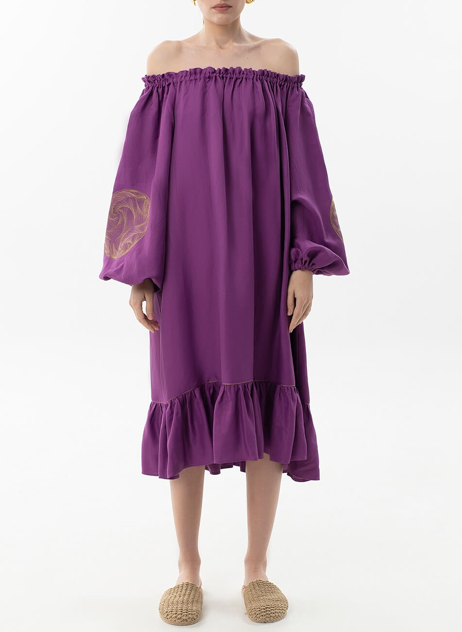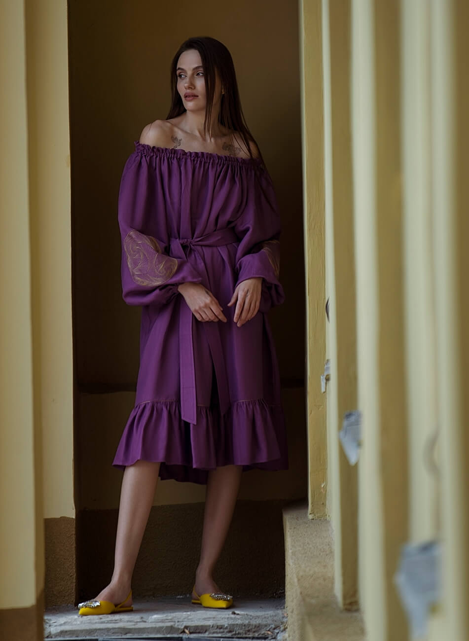 Сукня з льону вільного крою з об’ємними рукавами та спущеними плечима. Вишивка на рукавах – символ української ідентичності, а також частина ДНК-бренду. Вишивка виконана металізованими золотими нитками. У комплекті до сукні пояс.