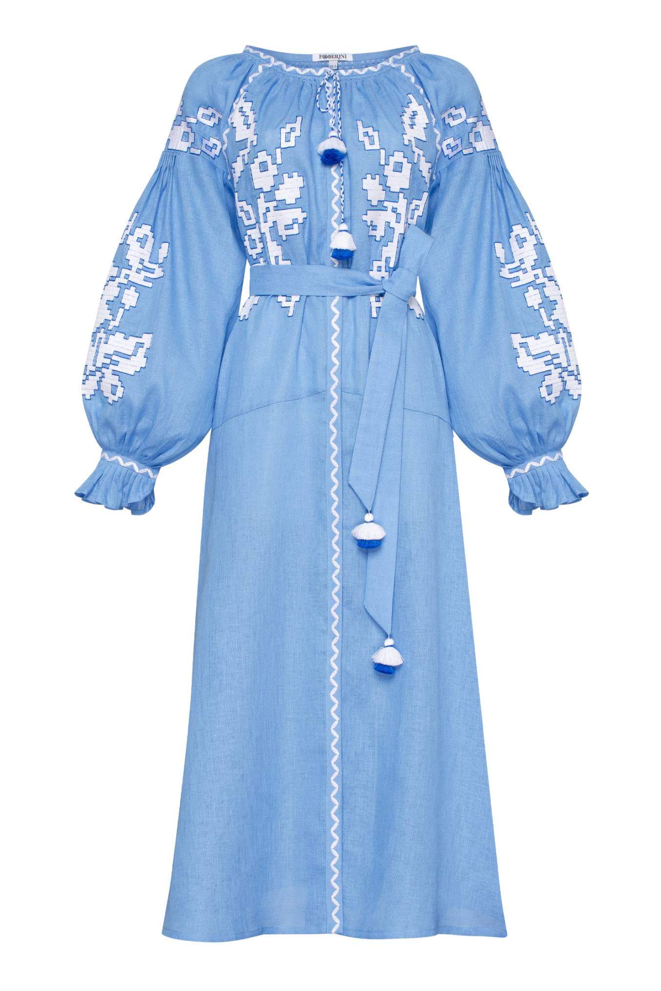 Доставка впродовж 2-5 робочих днівВитончена сукня А-подібного силуету з відрізним подолом. Прикрашена автентичною вишивкою на грудях, рукавах та передпліччі. Рукави доповнені старовинною технікою декорування “пухликами” та манжетами-воланами. Пояс та горловина прикрашені вишуканими двоярусними пензлями. Зручні застібки попереду по всій довжині. Сукня ідеально підійде для сімейних свят та урочистих подій.