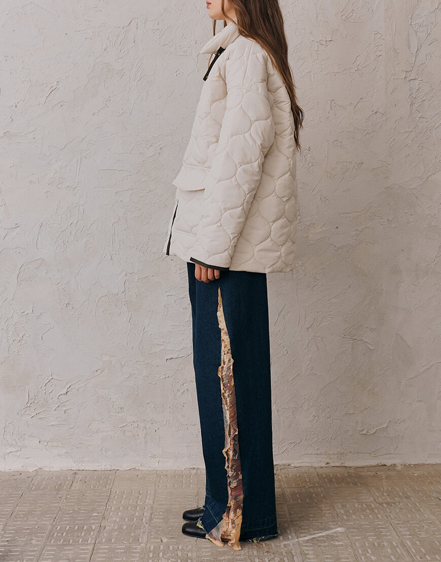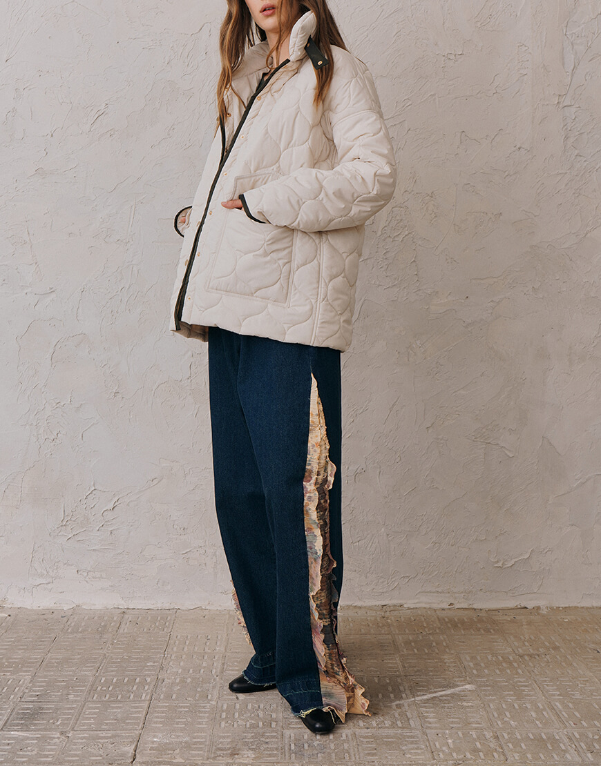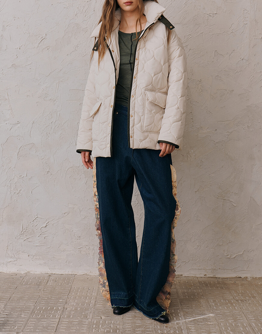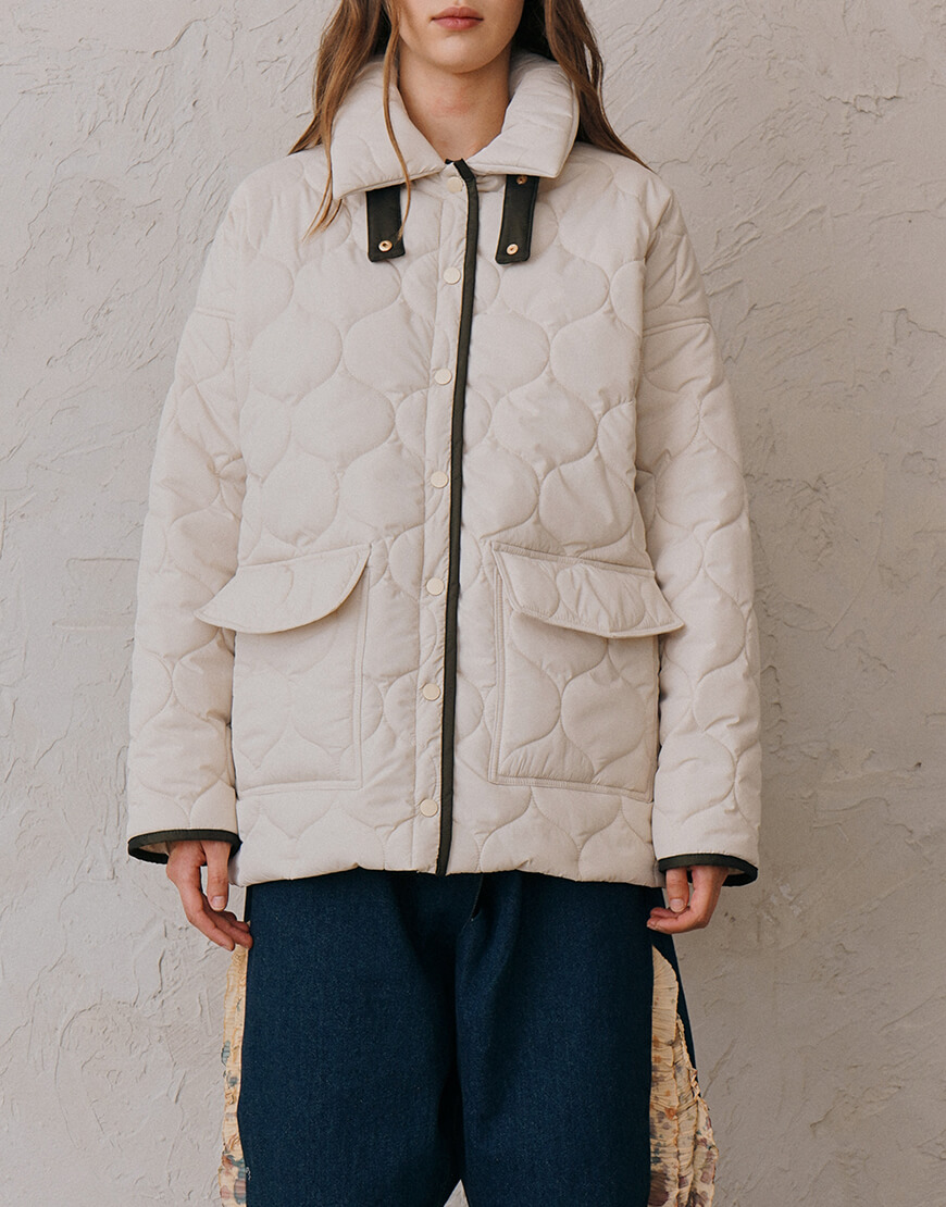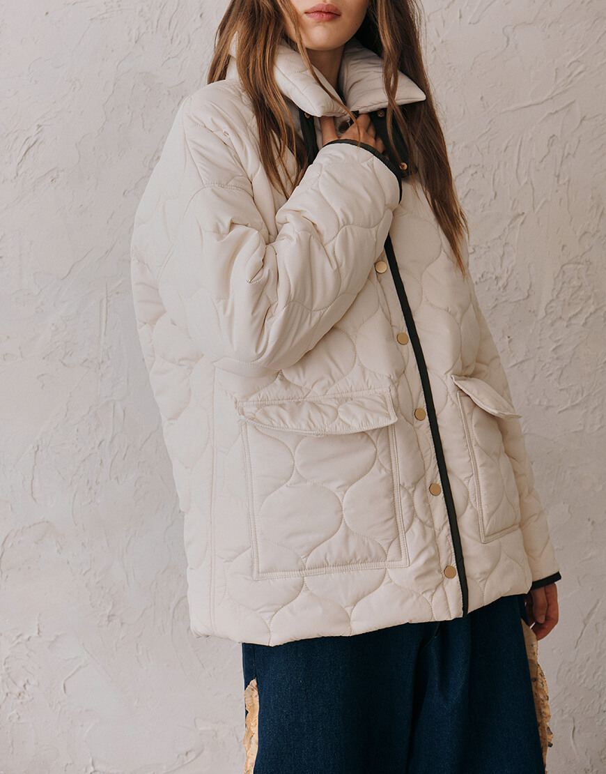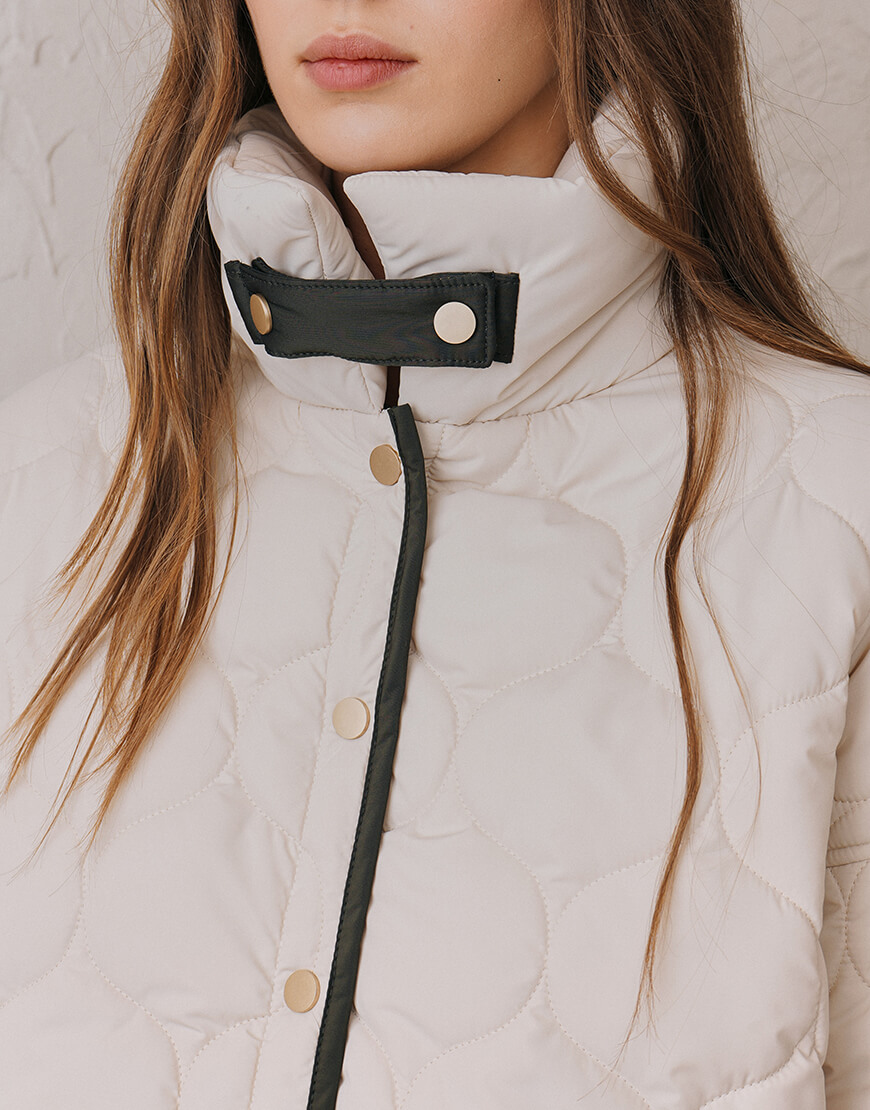 Down jacket стьобаний, прямого силуету, з контрастними деталями. Наявні дві кишені, застібка на кнопках. Також в комплекті є пояс на резинці з фастексом, який підкреслить вашу талію.
